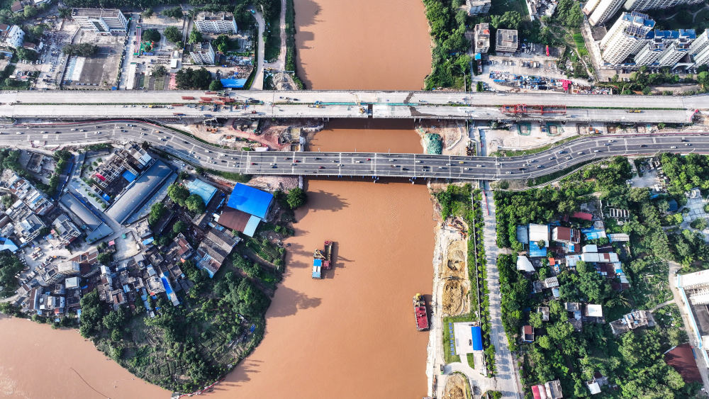 施工隊在廣西欽州市拆舊橋建新橋,疏浚平陸運河流經欽州市區(qū)的航道(2024年5月12日攝,無人機照片)。平陸運河建成后將成為廣西及西南地區(qū)通往東盟地區(qū)運距最短、最便捷的水運出海通道。