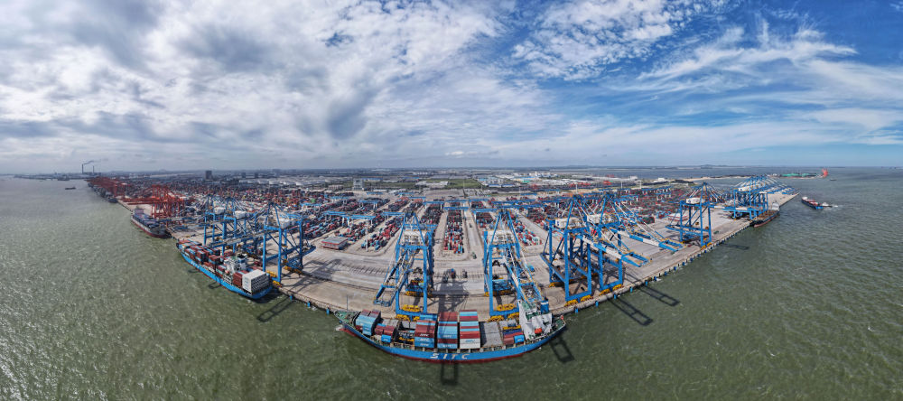 2024年6月13日,途經馬來西亞關丹港的“海豐博多”輪在廣西欽州港集裝箱裝卸自動化碼頭進行裝卸作業(yè)(無人機全景照片)。