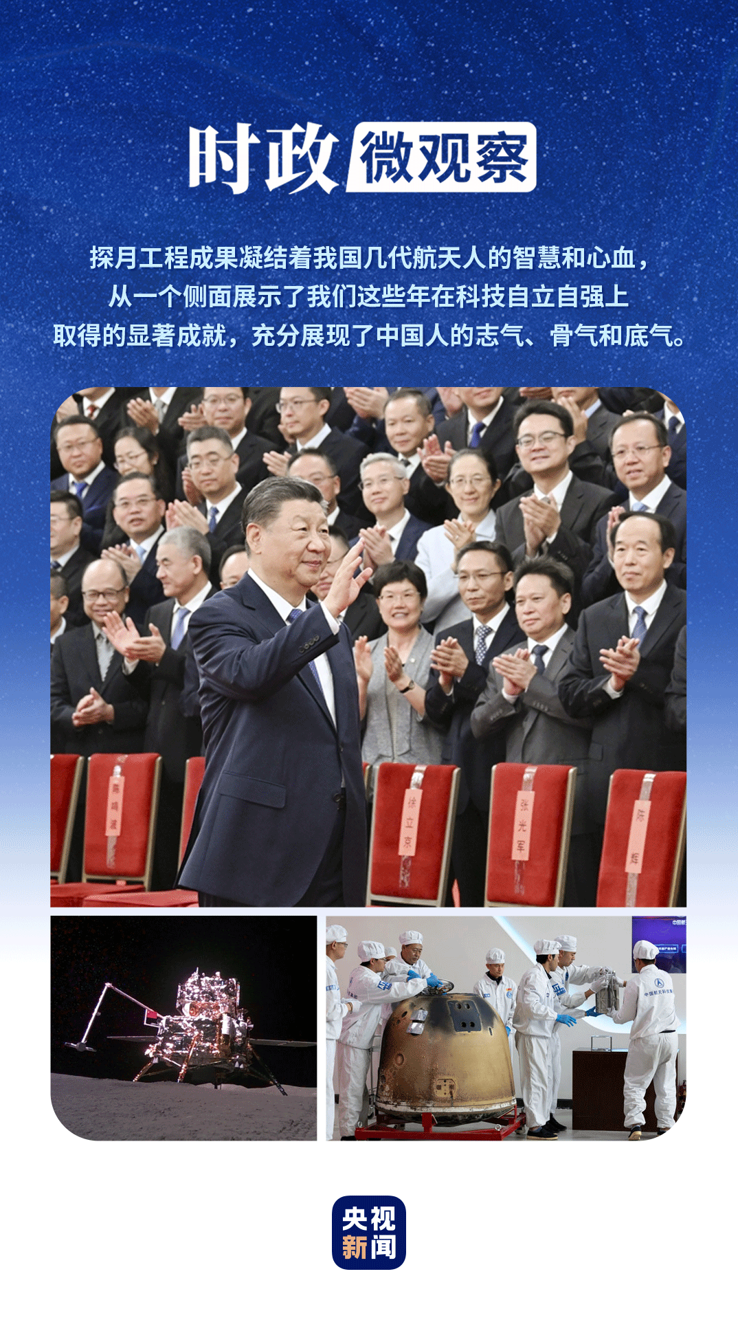 探月工程一路走來,從孫家棟、欒恩杰、歐陽自遠等科技大家,到胡浩、李東、張玉花等航天骨干,一代代航天人攻堅克難、勇攀高峰,共同托舉探月夢、航天夢。以地球搖籃為起點,中國航天人堅持自力更生、自主創(chuàng)新,推動航天事業(yè)從無到有、從弱到強、從“藍圖繪夢”到“奮斗圓夢”,實現(xiàn)歷史性、高質(zhì)量、跨越式發(fā)展,航天強國建設(shè)邁出堅實步伐。