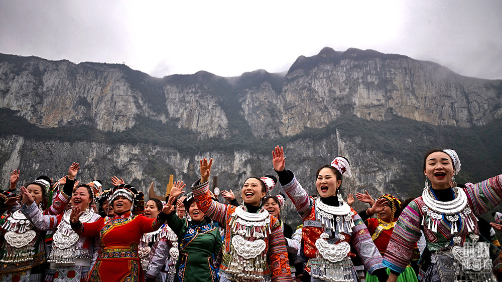 2021年2月,習近平總書記來到貴州化屋村考察,當?shù)卮迕裼脷g快的苗家歌舞迎接總書記。(總臺央視記者王哈男拍攝)