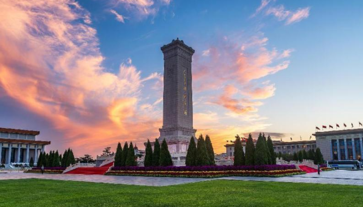 天安門廣場,晚霞映襯下的人民英雄紀念碑