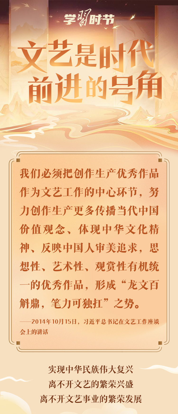 文藝是時(shí)代前進(jìn)的號(hào)角,最能代表一個(gè)時(shí)代的風(fēng)貌,最能引領(lǐng)一個(gè)時(shí)代的風(fēng)氣。十年來,在習(xí)近平總書記的指引下,我國文藝面貌發(fā)生深刻變化,一系列代表性作品、標(biāo)志性現(xiàn)象和時(shí)代性特征,勾畫了新時(shí)代文藝的獨(dú)特景觀,彰顯了新時(shí)代文藝的豐富內(nèi)涵。