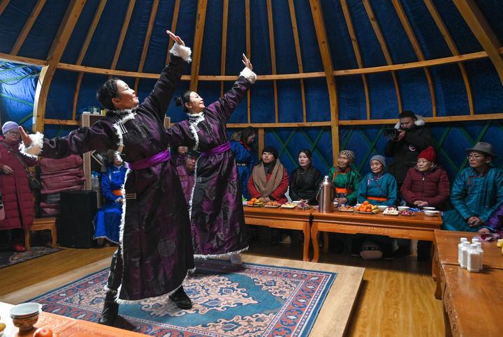 2023年12月21日,烏蘭牧騎隊(duì)員在內(nèi)蒙古阿其圖烏拉蘇木進(jìn)行舞蹈表演。
