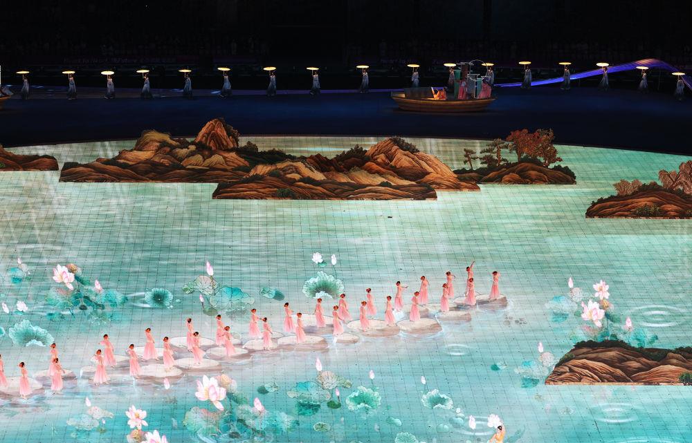 2023年9月23日,演員在杭州亞運(yùn)會(huì)開(kāi)幕式上表演?!肚Ю锝綀D》和《富春山居圖》兩幅國(guó)寶級(jí)名畫(huà),通過(guò)數(shù)字技術(shù),成為移動(dòng)的山水。