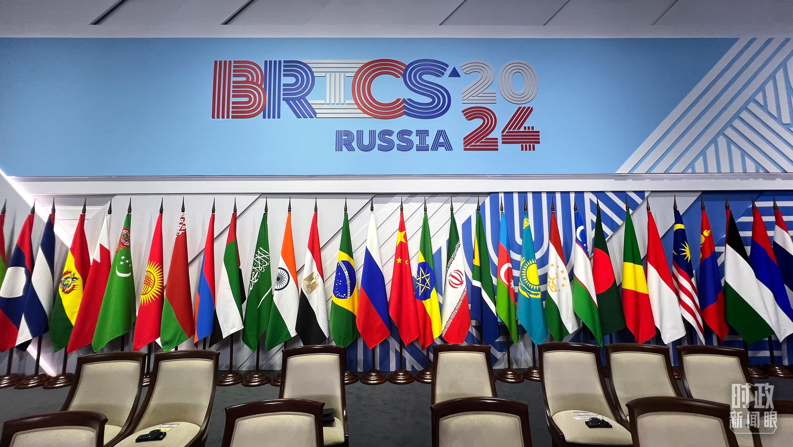 △“金磚+”領(lǐng)導(dǎo)人對(duì)話會(huì)現(xiàn)場(chǎng)的旗陣。(總臺(tái)央視記者程鋮拍攝)