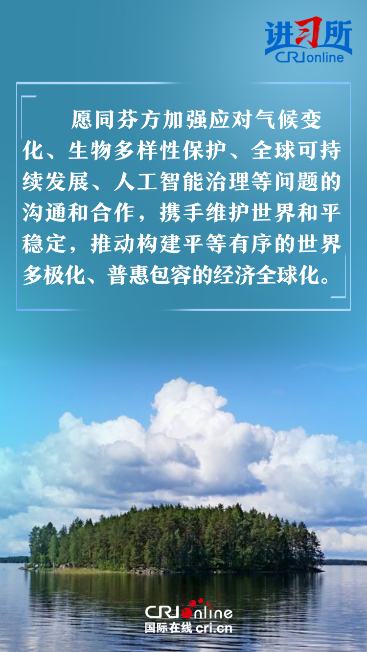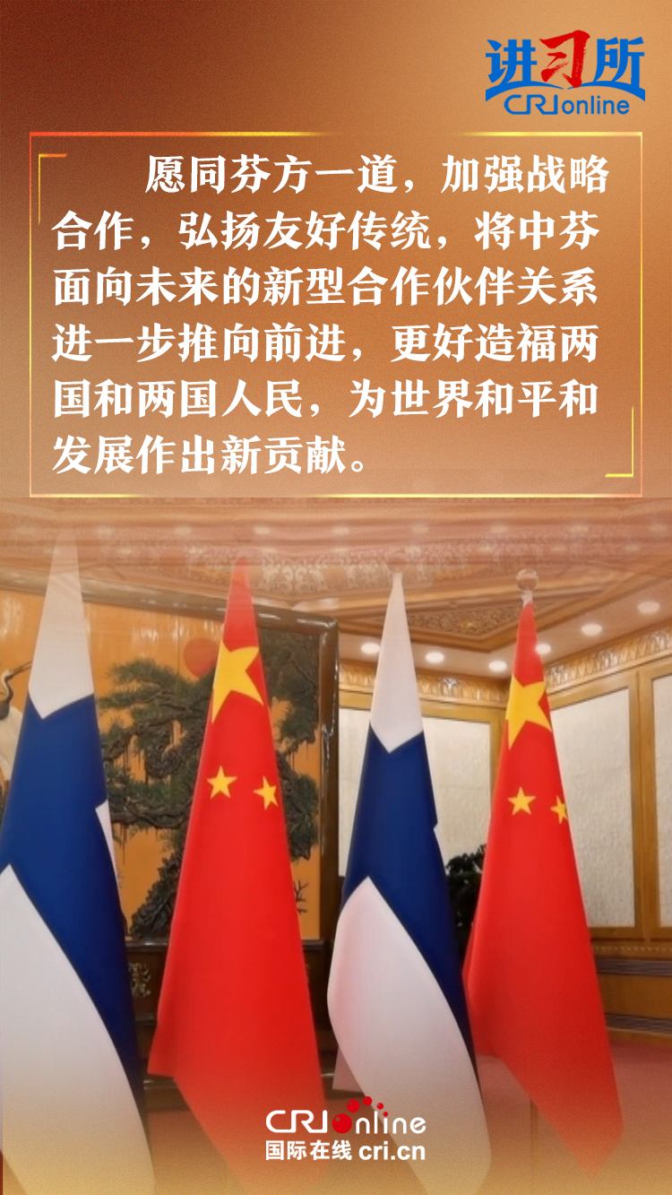 習(xí)近平指出,建交以來,中芬始終友好相處、互尊互信,樹立了國與國之間超越歷史、文化、制度差異,平等交往的典范。中方愿同芬方一道,加強(qiáng)戰(zhàn)略合作,弘揚(yáng)友好傳統(tǒng),將中芬面向未來的新型合作伙伴關(guān)系進(jìn)一步推向前進(jìn),更好造福兩國和兩國人民,為世界和平和發(fā)展作出新貢獻(xiàn)。