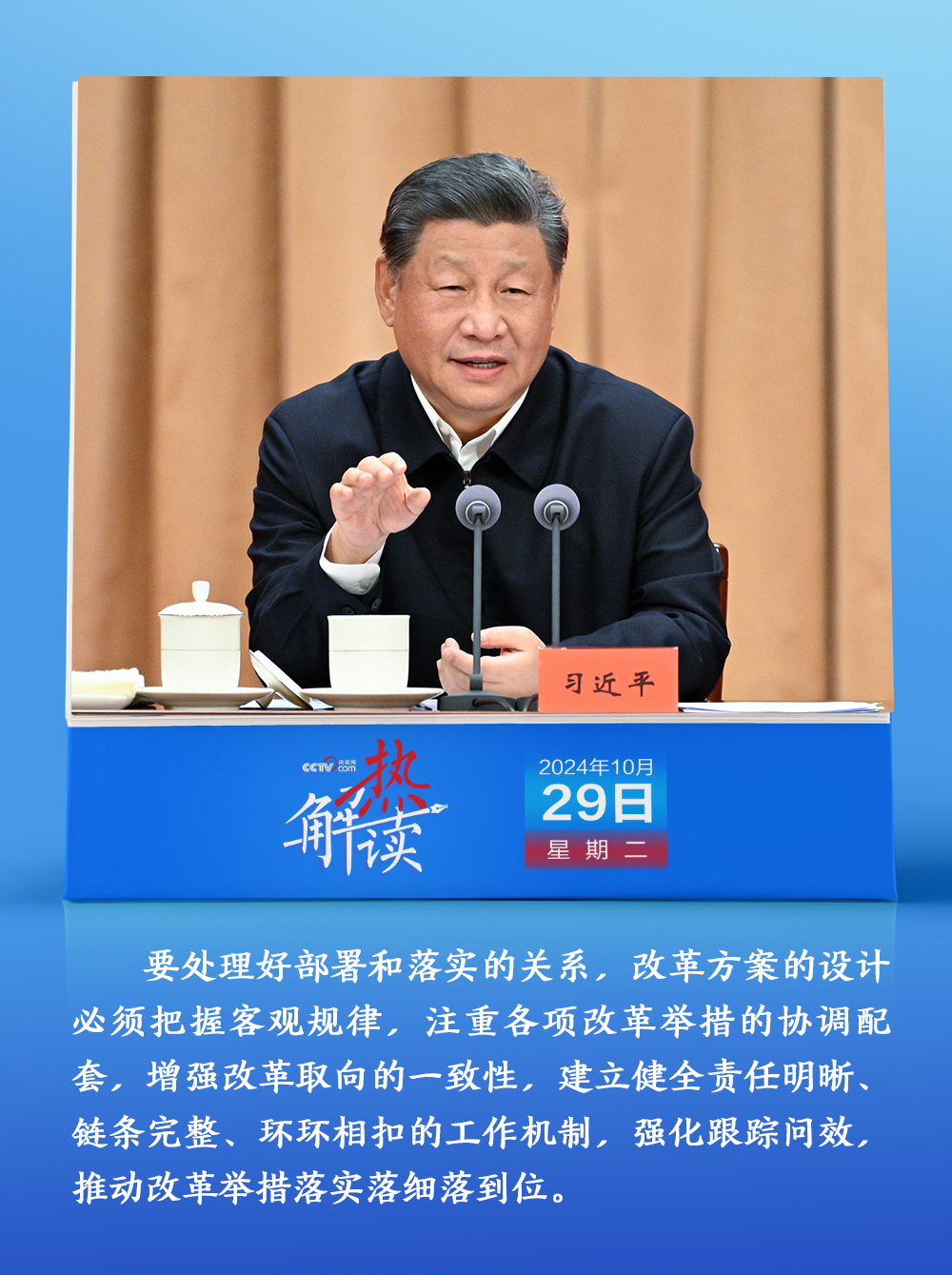 熱解讀10月29日,省部級主要領(lǐng)導(dǎo)干部學(xué)習(xí)貫徹黨的二十屆三中全會(huì)精神專題研討班開班。在開班式上,習(xí)近平總書記明確提出要“處理好部署和落實(shí)的關(guān)系”,“建立健全責(zé)任明晰、鏈條完整、環(huán)環(huán)相扣的工作機(jī)制,強(qiáng)化跟蹤問效,推動(dòng)改革舉措落實(shí)落細(xì)落到位”。