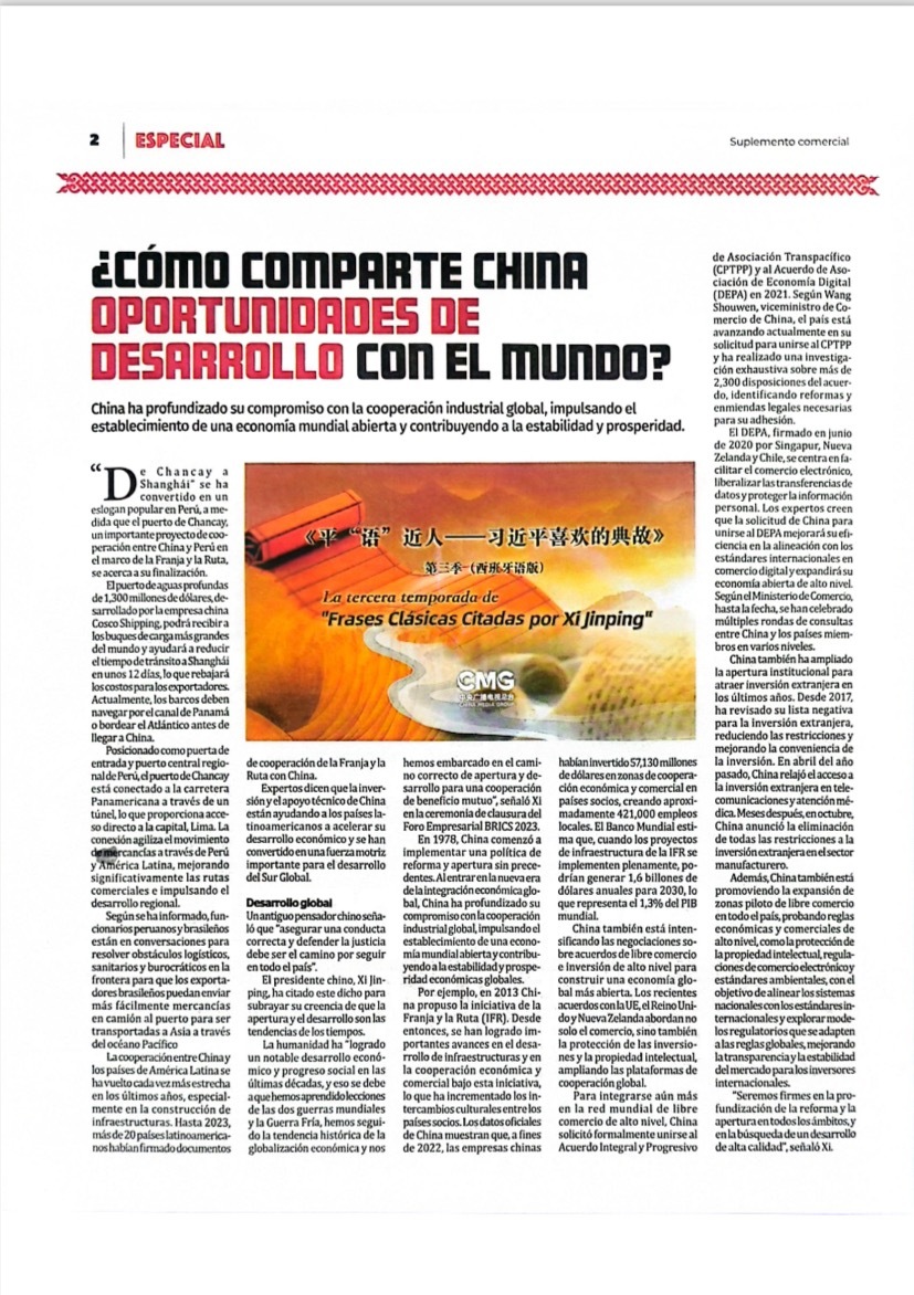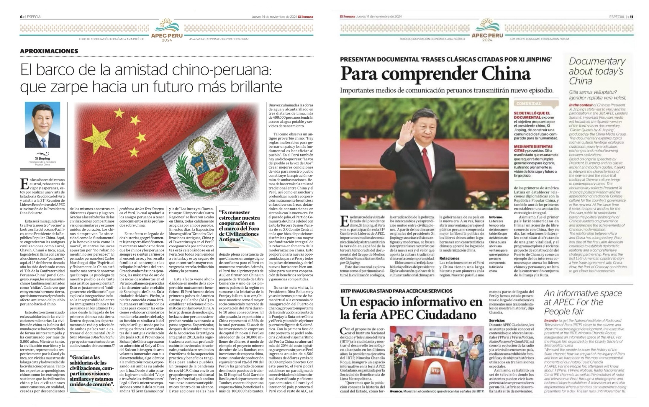 11月14日,秘魯最具影響力的官方報(bào)紙《秘魯人報(bào)》刊發(fā)節(jié)目在秘魯落播的消息。文章指出,《平“語(yǔ)”近人——習(xí)近平喜歡的典故》第三季展現(xiàn)了中華民族開放包容、兼收并蓄的文化胸懷,闡釋了習(xí)近平主席提出的推動(dòng)構(gòu)建人類命運(yùn)共同體的這一重大理念,是對(duì)“建設(shè)一個(gè)什么樣的世界、怎樣建設(shè)這個(gè)世界”給出的中國(guó)方案。《秘魯人報(bào)》特刊整版刊發(fā)《平“語(yǔ)”近人——習(xí)近平喜歡的典故》第三季(西班牙語(yǔ)版)將在秘魯主流媒體落播特稿?!睹佤斎藞?bào)》官網(wǎng)也同步刊發(fā)了節(jié)目預(yù)告消息和海報(bào)。