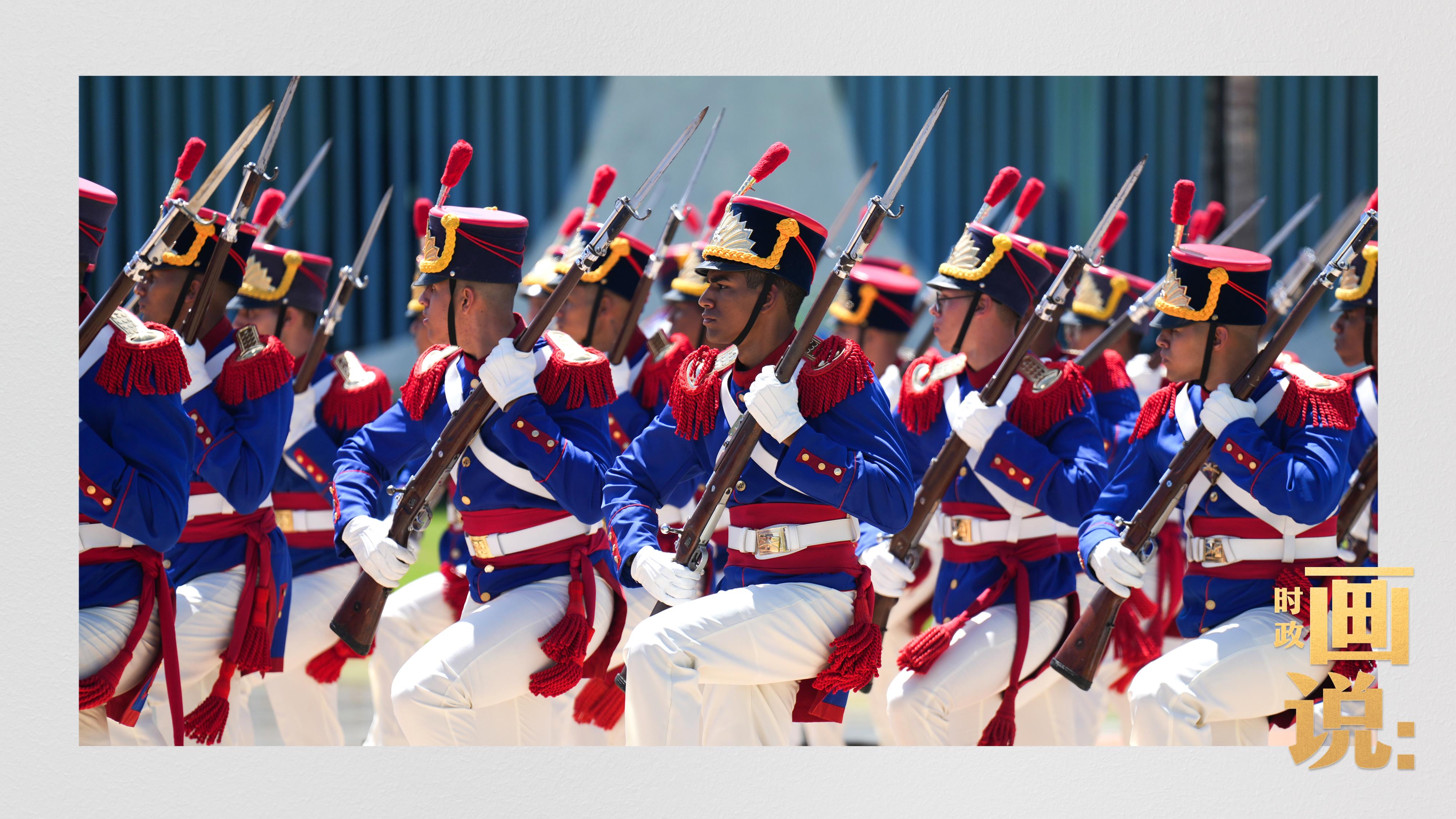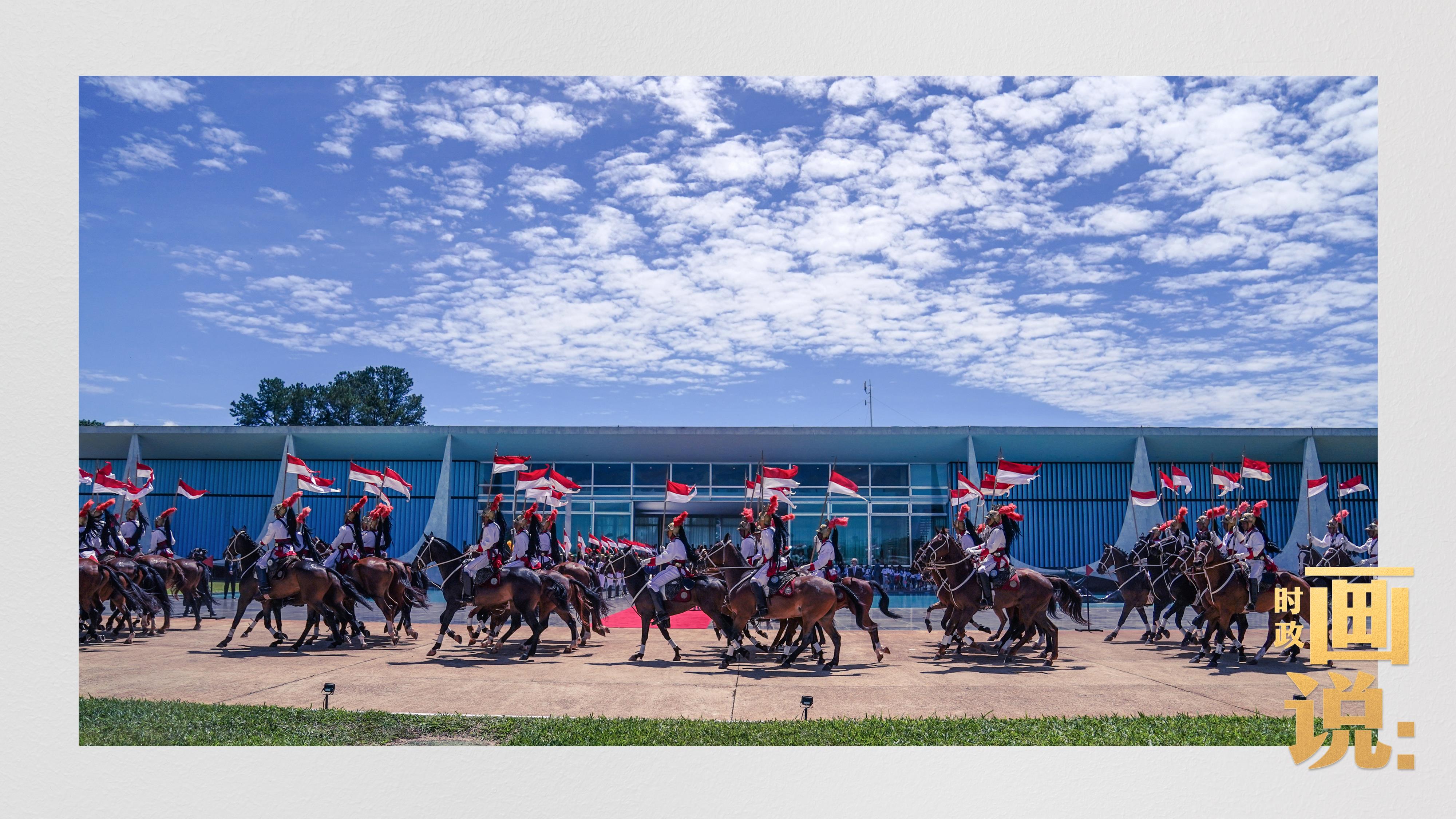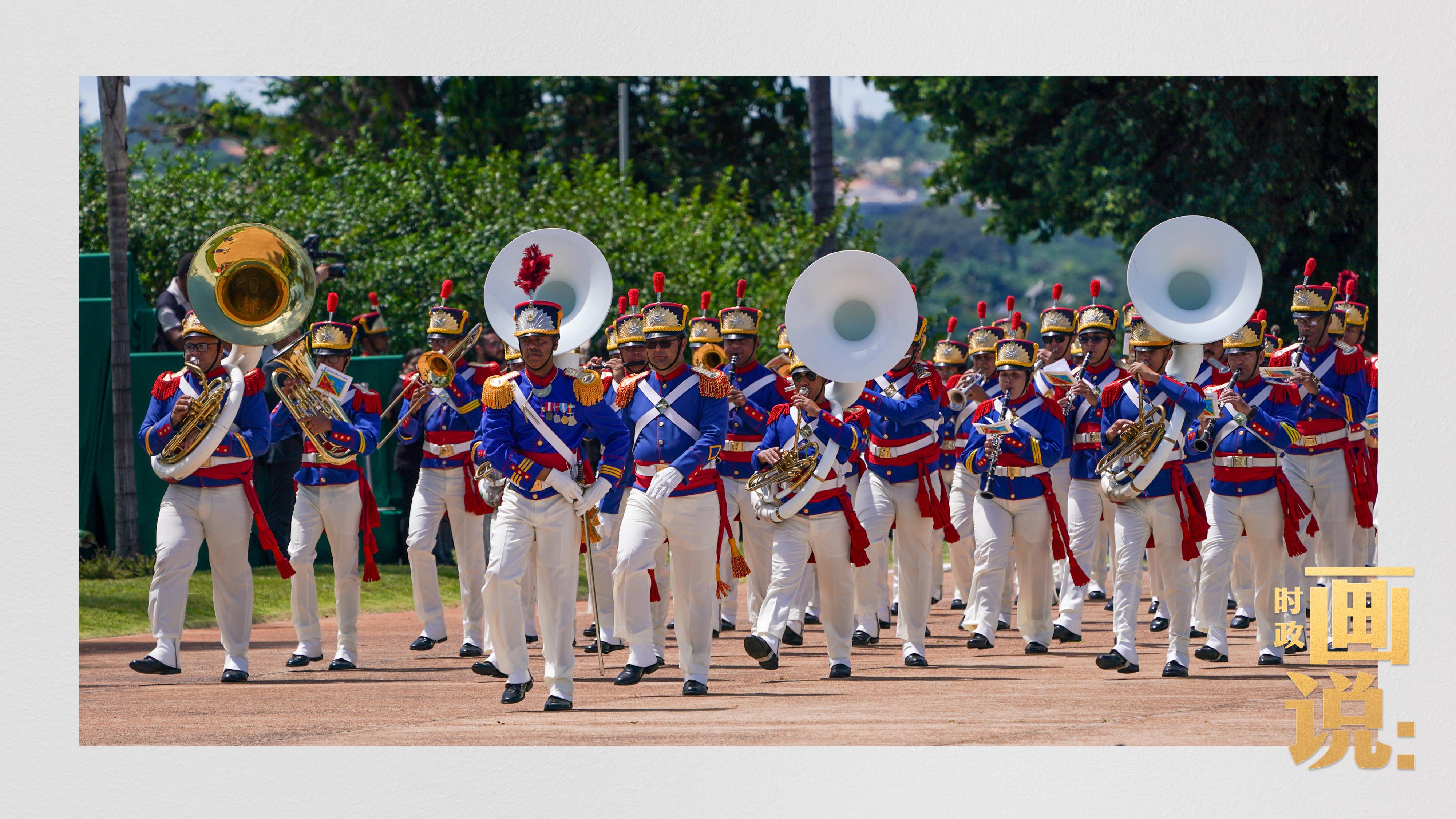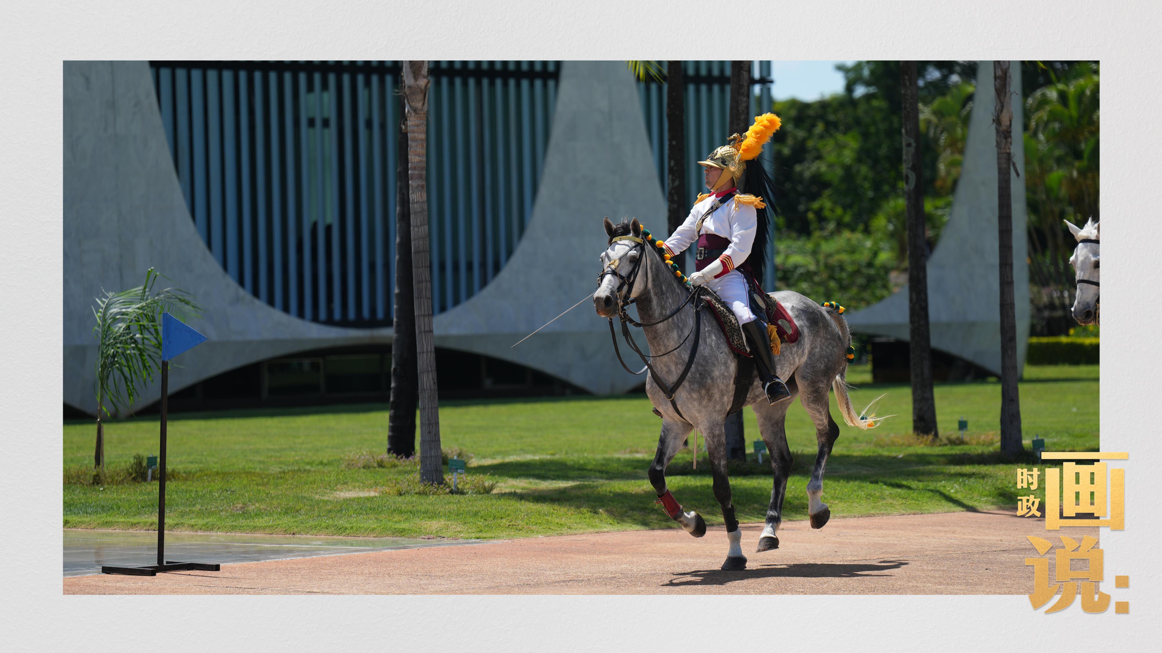 騎兵護衛(wèi)習近平主席專車抵達儀式現場,巴西藝術家用中文深情唱響中國經典民歌《我的祖國》,現場氣氛隆重熱烈。