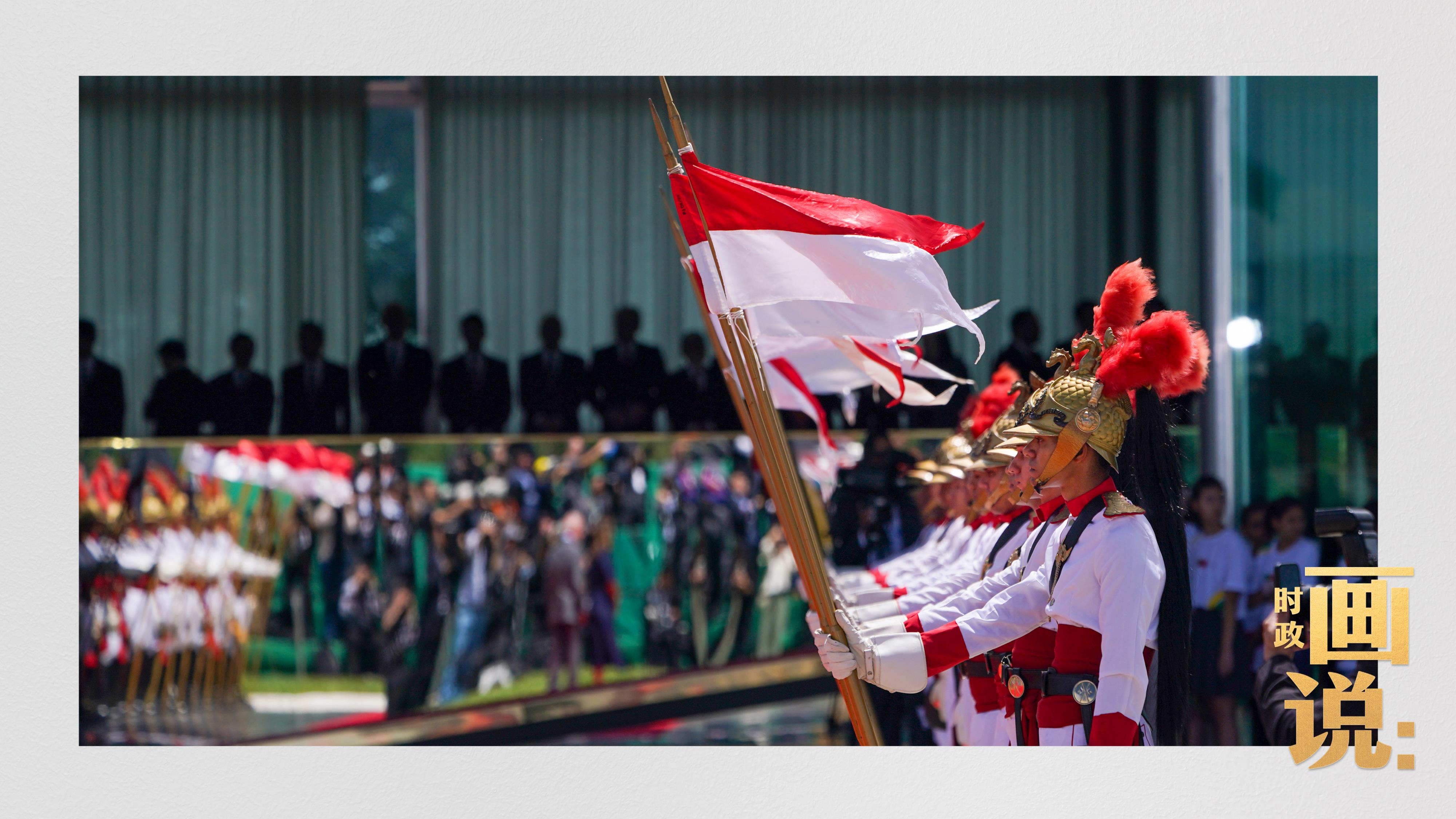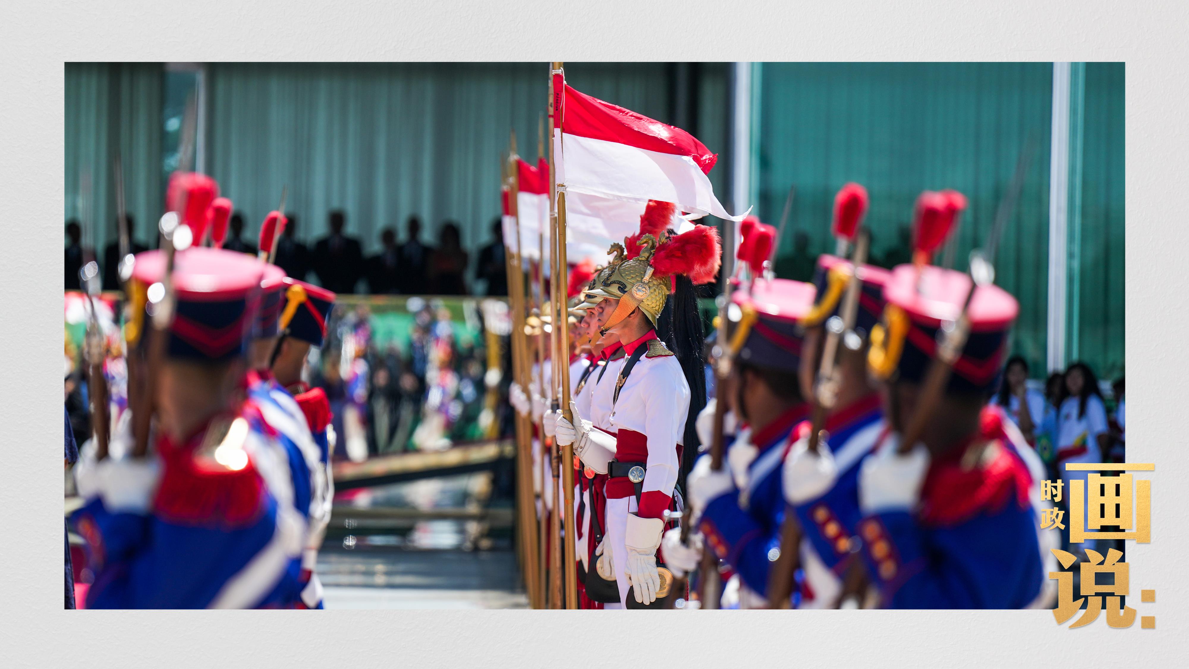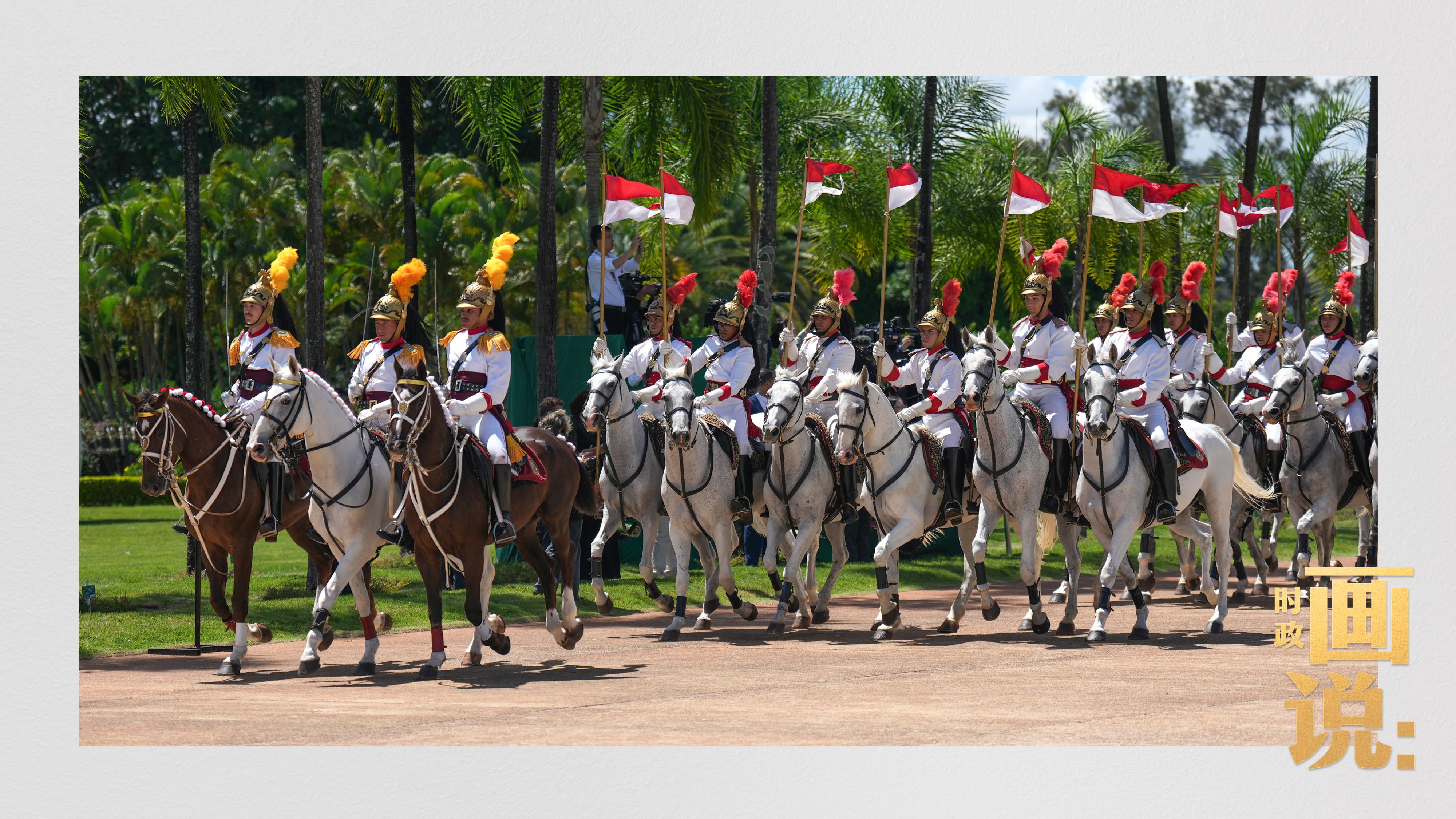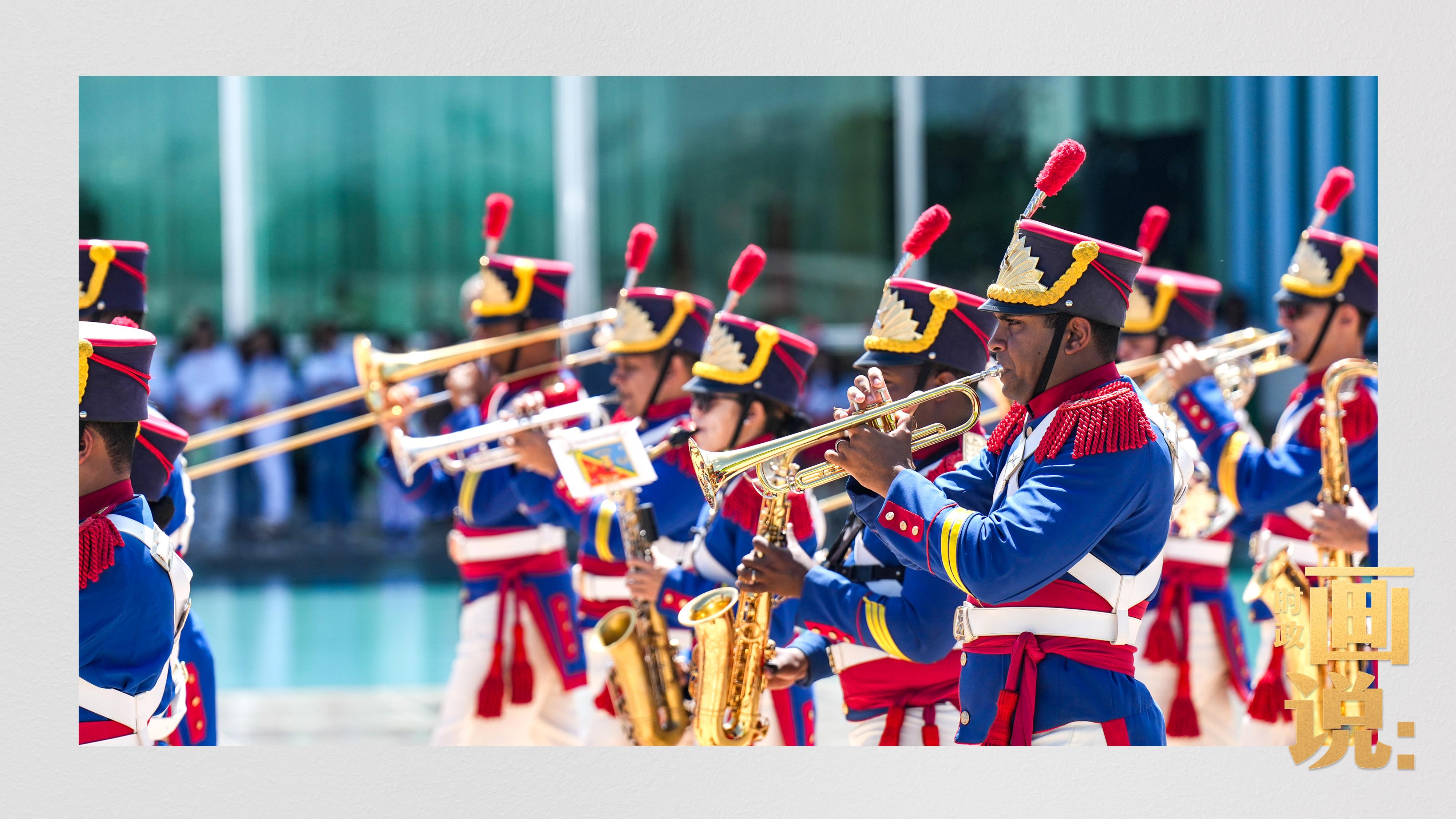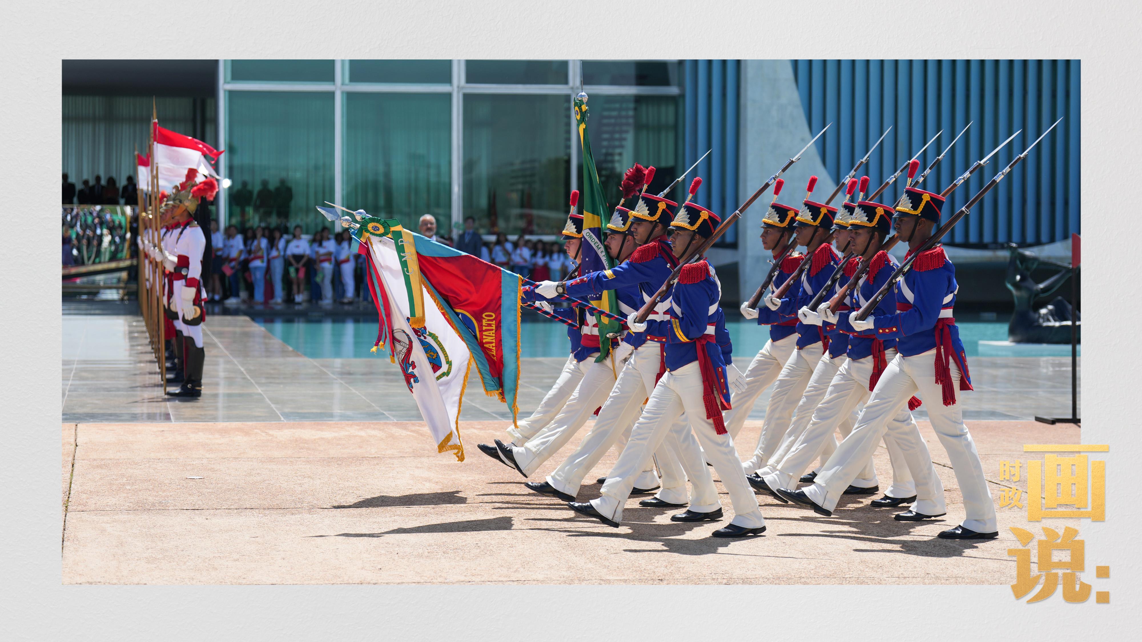 騎兵護衛(wèi)習近平主席專車抵達儀式現場,巴西藝術家用中文深情唱響中國經典民歌《我的祖國》,現場氣氛隆重熱烈。