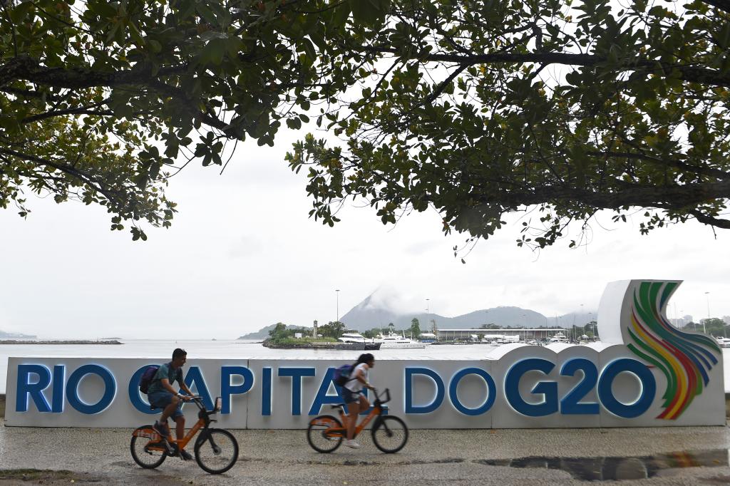 11月16日,在巴西里約熱內(nèi)盧,人們騎車經(jīng)過二十國集團(tuán)領(lǐng)導(dǎo)人峰會(huì)舉辦地附近的峰會(huì)標(biāo)識(shí)。新華社發(fā)(盧西奧·塔沃拉攝)