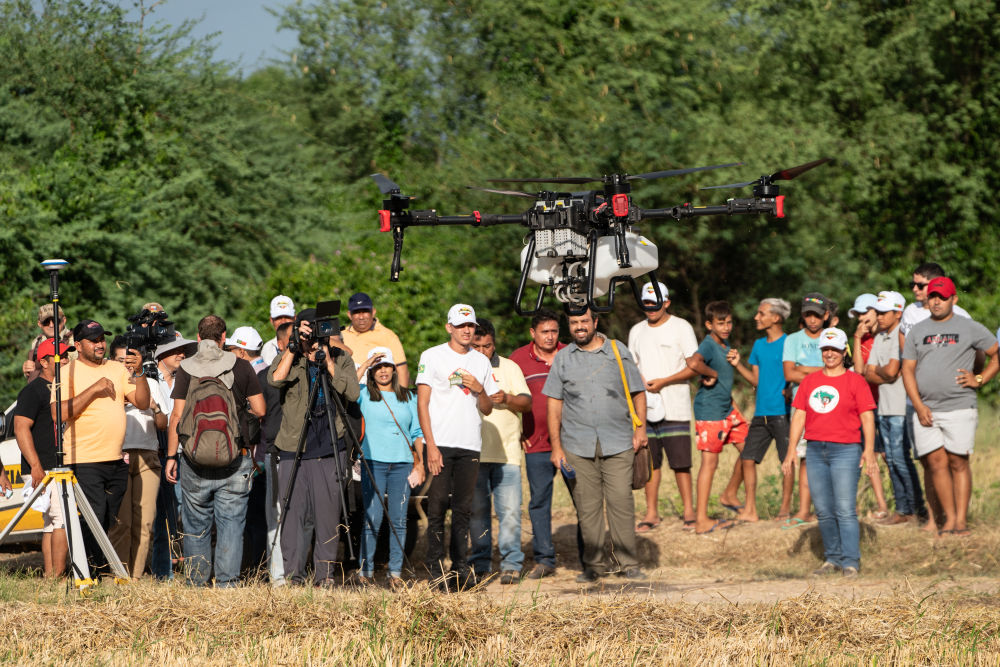 2024年2月2日,在巴西阿波迪,人們觀看一款中國生產(chǎn)的農(nóng)用無人機(jī)。當(dāng)日,中巴農(nóng)業(yè)機(jī)械化合作示范項(xiàng)目啟動儀式在巴西阿波迪舉行,第一批來自中國7家農(nóng)機(jī)企業(yè)共31臺(件)設(shè)備正式交付給巴西農(nóng)村勞動者組織。新華社記者 王天聰 攝