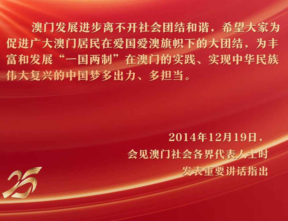 25年來,澳門社會(huì)各界在愛國愛澳的旗幟下實(shí)現(xiàn)廣泛團(tuán)結(jié),愛國愛澳力量在社會(huì)政治生活中始終占據(jù)主導(dǎo),為特區(qū)政府依法有效施政、確保“一國兩制”在澳門成功實(shí)踐奠定了堅(jiān)實(shí)的基礎(chǔ)。