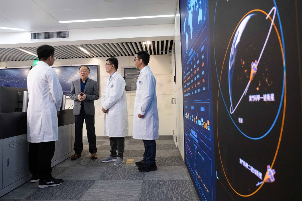 2024年12月4日,“澳科一號(hào)”衛(wèi)星項(xiàng)目助理研究員尹亮(左一)與同事交流。