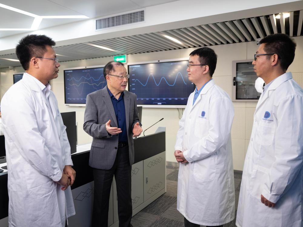 12月4日,澳門空間技術(shù)與應(yīng)用研究院院長張可可(左二)和“澳科一號”衛(wèi)星項目助理研究員尹亮(右二)交流。新華社發(fā)(張金加 攝)