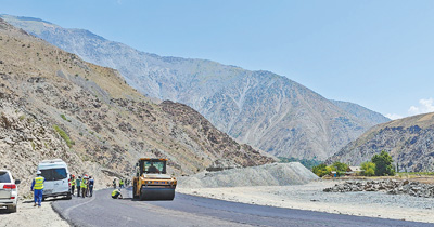 中塔公路二期項目建設(shè)現(xiàn)場,兩國工作人員正在平整瀝青路面。本報記者 程是頡攝