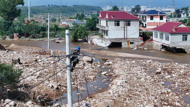 2024年8月22日,葫蘆島市電力部門工作人員在搶修因洪災(zāi)中斷的線路。