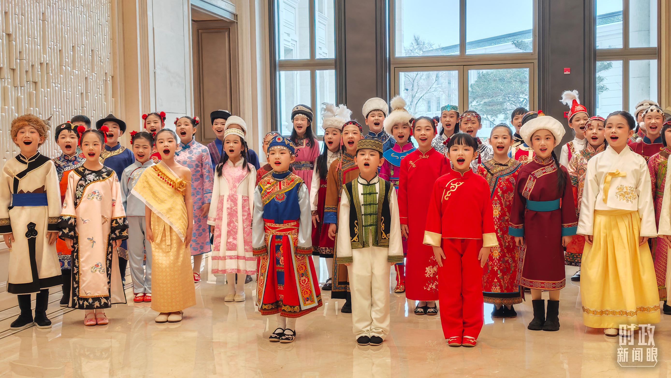 歡迎宴會(huì)現(xiàn)場(chǎng),少年兒童正在合唱黑龍江民歌《烏蘇里船歌》。(總臺(tái)央視記者閆耀東拍攝)