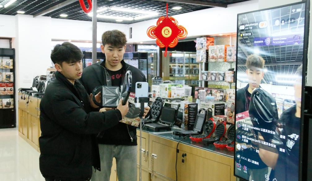 2月18日,在中哈霍爾果斯國際邊境合作中心的義烏國際商貿(mào)城里,跨境電商主播向中亞消費(fèi)者介紹中國商品。(馬婷婷 攝)