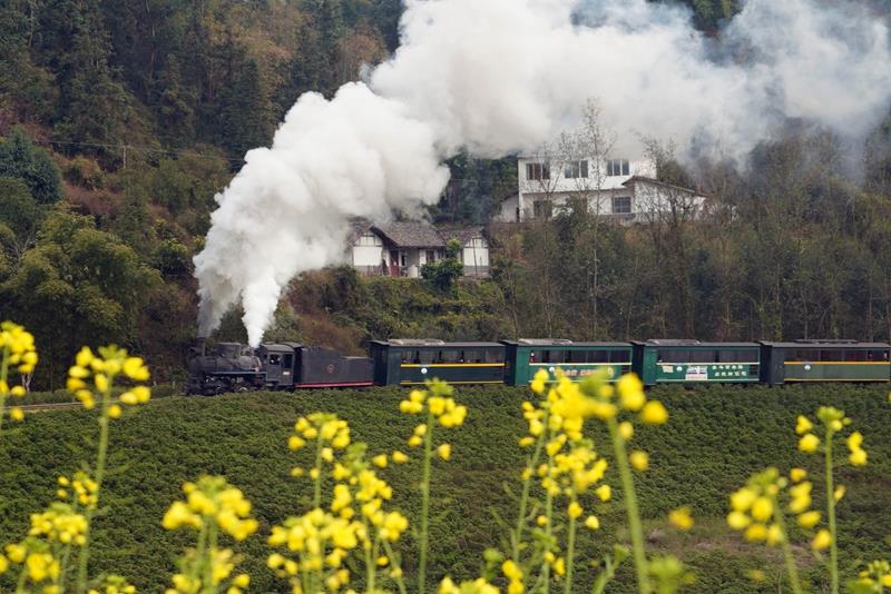 2025年2月14日,四川樂(lè)山市犍為縣菜子壩景點(diǎn)試種的早季油菜花進(jìn)入盛開(kāi)期,蒸汽小火車(chē)穿越油菜花海,吸引不少游客前來(lái)觀看。