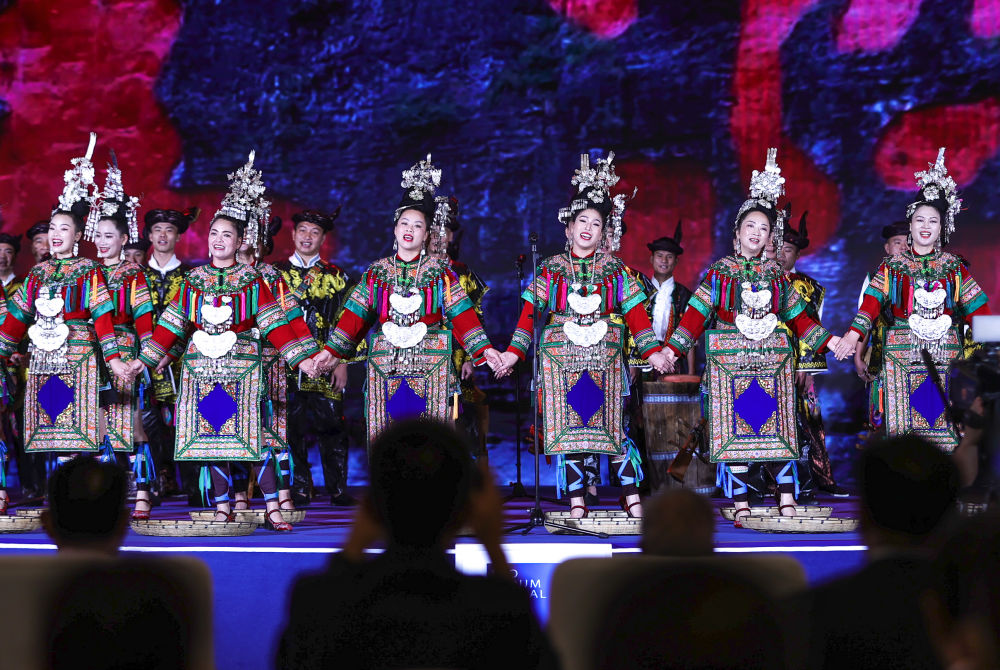 2023年7月9日,演員在2023年生態(tài)文明貴陽國際論壇閉幕式上演唱侗族大歌。