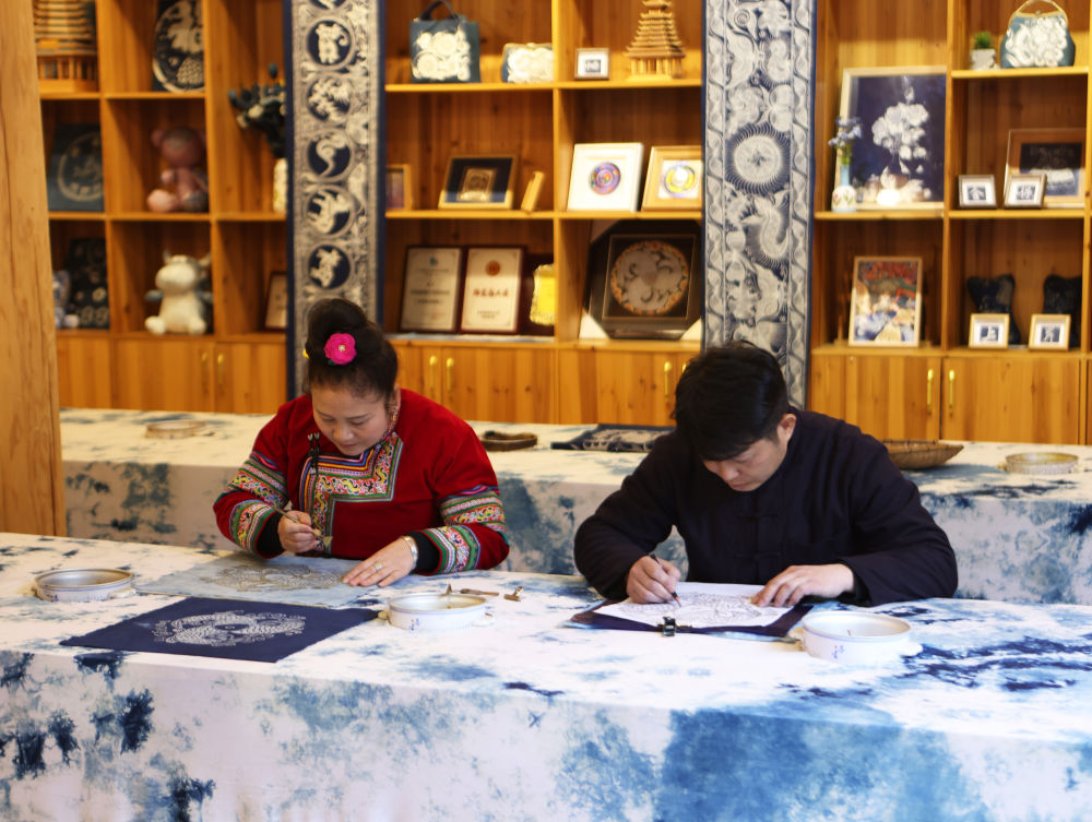 2025年3月14日,村民在肇興侗寨內(nèi)制作蠟染。近年來,當(dāng)?shù)丶哟髮ι贁?shù)民族非遺文創(chuàng)產(chǎn)品的研發(fā)和創(chuàng)新力度,同時進(jìn)一步加強(qiáng)線上銷售,通過微信、網(wǎng)上直播、網(wǎng)店等方式進(jìn)行帶貨,讓當(dāng)?shù)厝罕娡ㄟ^指尖增收致富。