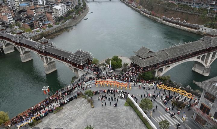 2024年2月22日,在貴州省黔東南苗族侗族自治州錦屏縣,舞龍隊經(jīng)過兩座風(fēng)雨橋的交匯處。風(fēng)雨橋,又稱“花橋”,是侗族的標(biāo)志性建筑之一。因橋上建有廊和亭,既可行人又可遮蔽風(fēng)雨,故稱風(fēng)雨橋。其以木為料、以榫銜接,是侗族橋梁建筑藝術(shù)的結(jié)晶。鼓樓、花橋的侗族木構(gòu)建筑營造技藝被列入國家級非物質(zhì)文化遺產(chǎn)代表性項目。