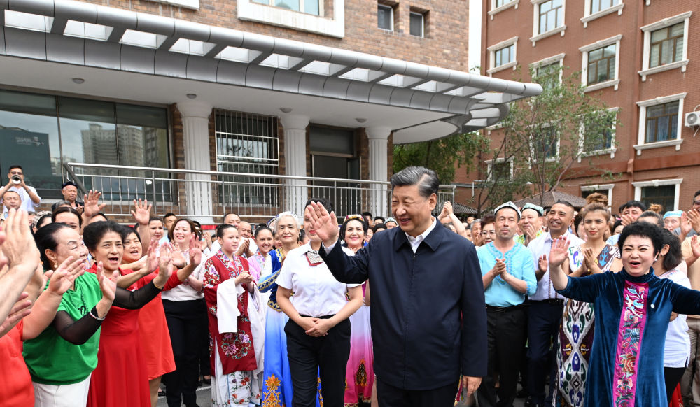 2022年7月13日上午,習(xí)近平在新疆烏魯木齊市天山區(qū)固原巷社區(qū)考察時(shí),身著民族服裝的各族群眾簇?fù)碓诳倳浬磉?,載歌載舞,向總書記表達(dá)由衷的愛戴。