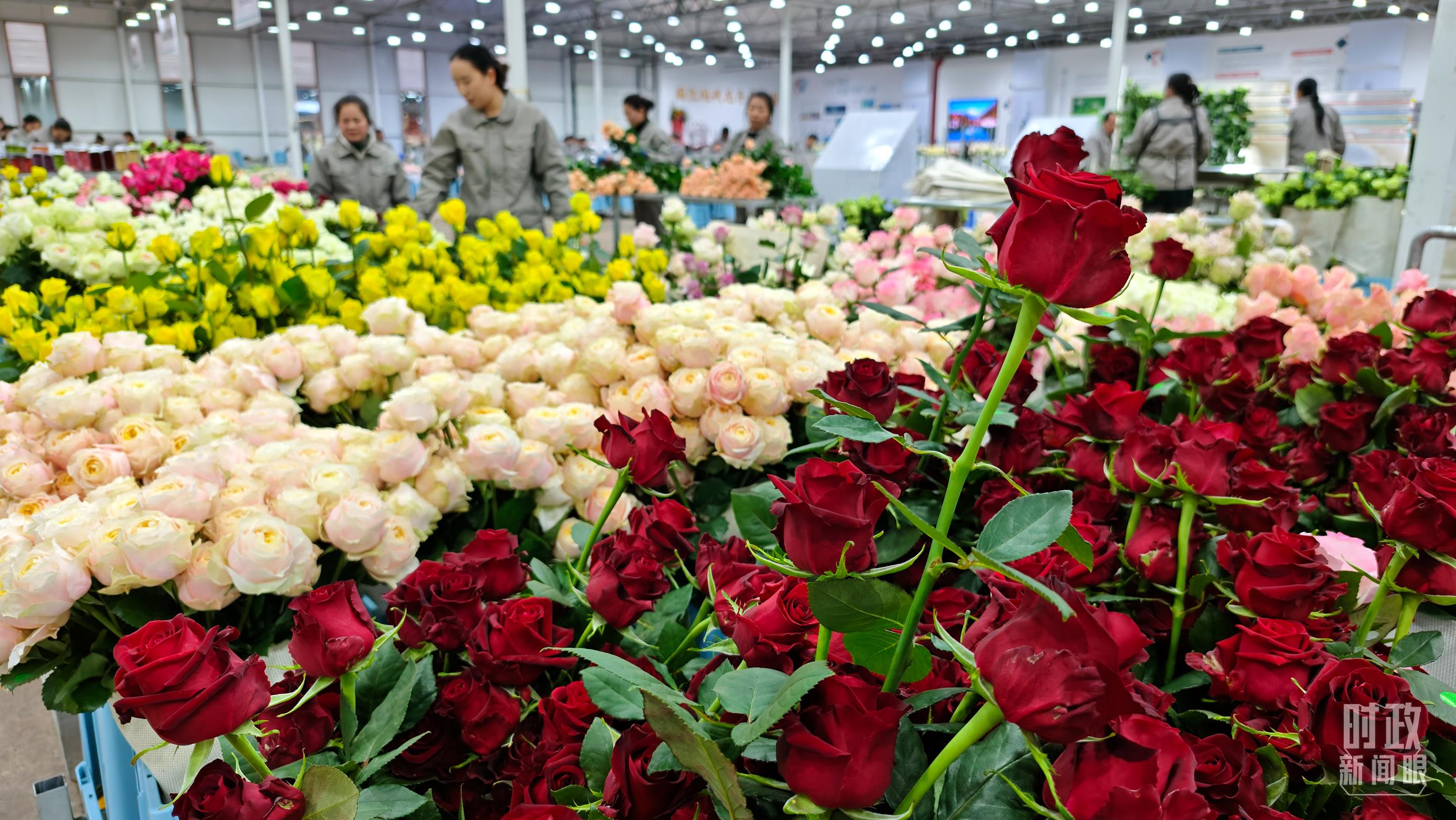 工人正在對采摘下來的鮮花進(jìn)行整理、分類。(總臺央視記者邢彬拍攝)