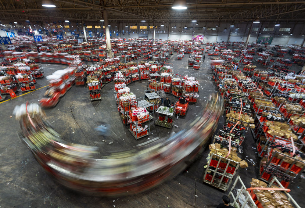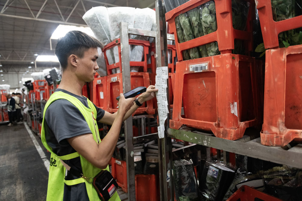 2023年7月13日,一名工作人員在昆明國(guó)際花卉拍賣交易中心內(nèi)對(duì)臺(tái)車上存放的鮮花掃碼。
