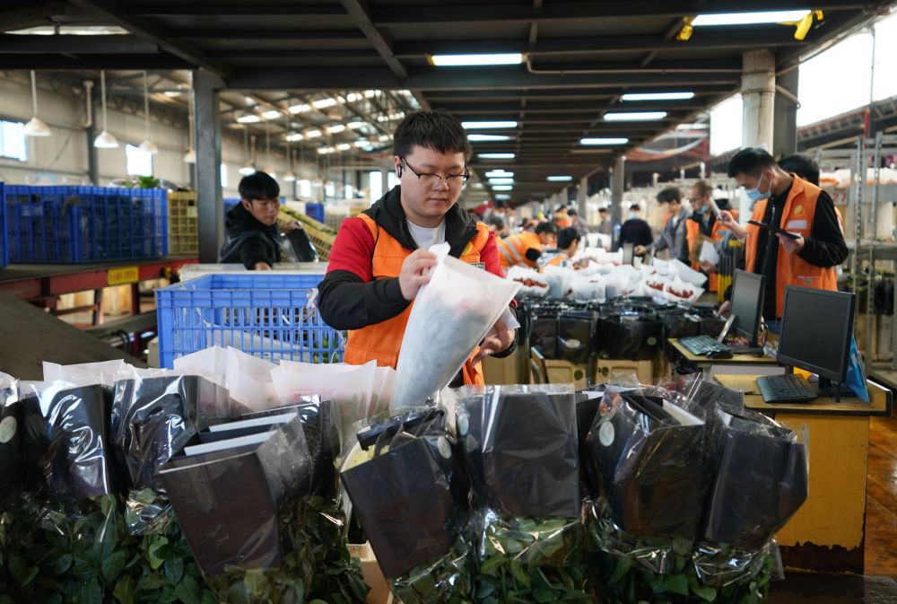 2022年11月11日,工作人員在昆明斗南花市給鮮花貼標(biāo)簽。快遞物流時(shí)效不斷優(yōu)化、冷鏈運(yùn)輸技術(shù)持續(xù)提升,也為中國(guó)鮮花加速“出海”保駕護(hù)航。