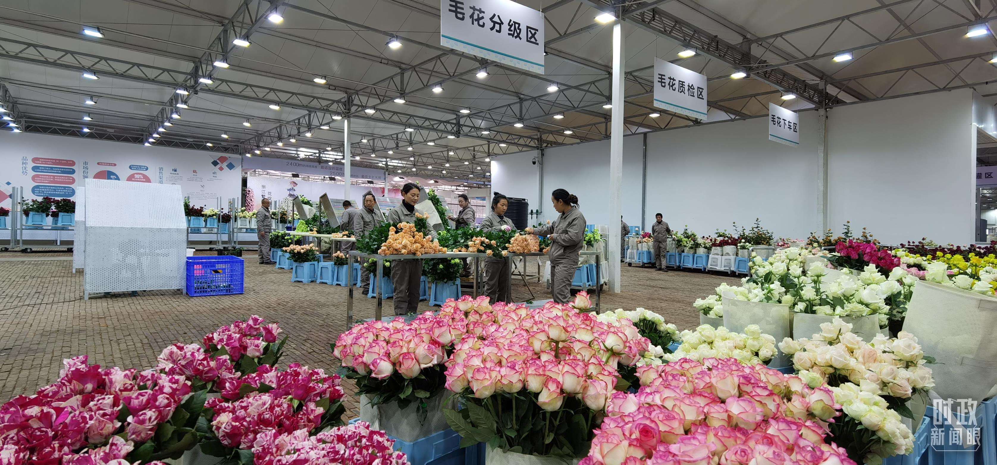 麗江現(xiàn)代花卉產(chǎn)業(yè)園內(nèi),工人正在分類整理鮮花。(總臺央視記者郭鴻拍攝)