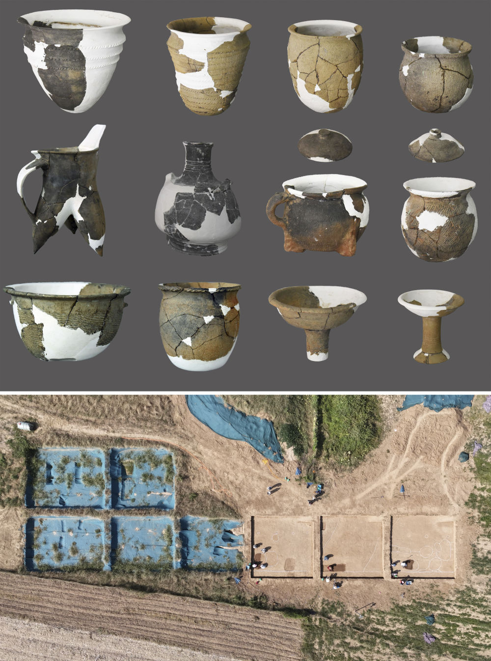 拼版照片:上圖為位于河南南陽(yáng)方城縣的八里橋遺址出土的陶器(河南省文物考古研究院供圖);下圖為八里橋遺址發(fā)掘現(xiàn)場(chǎng)(無人機(jī)照片,新華社記者袁月明2024年9月11日攝)。八里橋遺址是豫南地區(qū)已發(fā)現(xiàn)規(guī)模最大、等級(jí)最高的二里頭文化聚落,為探索夏文化地方城邑聚落形態(tài)、社會(huì)結(jié)構(gòu)提供了新線索。