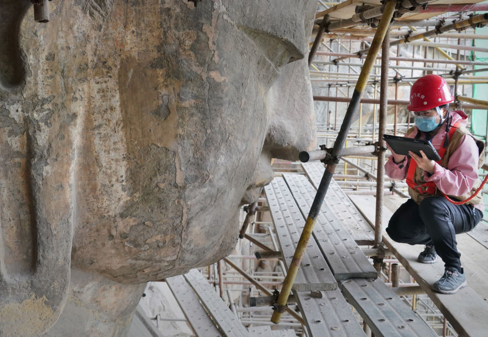 奉先寺位于河南洛陽(yáng)龍門西山南段,是龍門石窟開鑿規(guī)模最大、最具代表性的摩崖像龕。2022年7月,龍門石窟奉先寺大型滲漏水治理和危巖體加固保護(hù)工程完工。這是工作人員在龍門石窟奉先寺進(jìn)行勘測(cè)作業(yè)(2022年4月14日攝)。