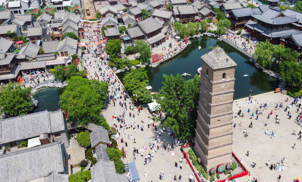 這是位于河南洛陽(yáng)的洛邑古城景區(qū)(2023年5月2日攝,無人機(jī)照片)。洛邑古城里精致的布景、各色表演和漢服妝造拍攝吸引大量游客前來。