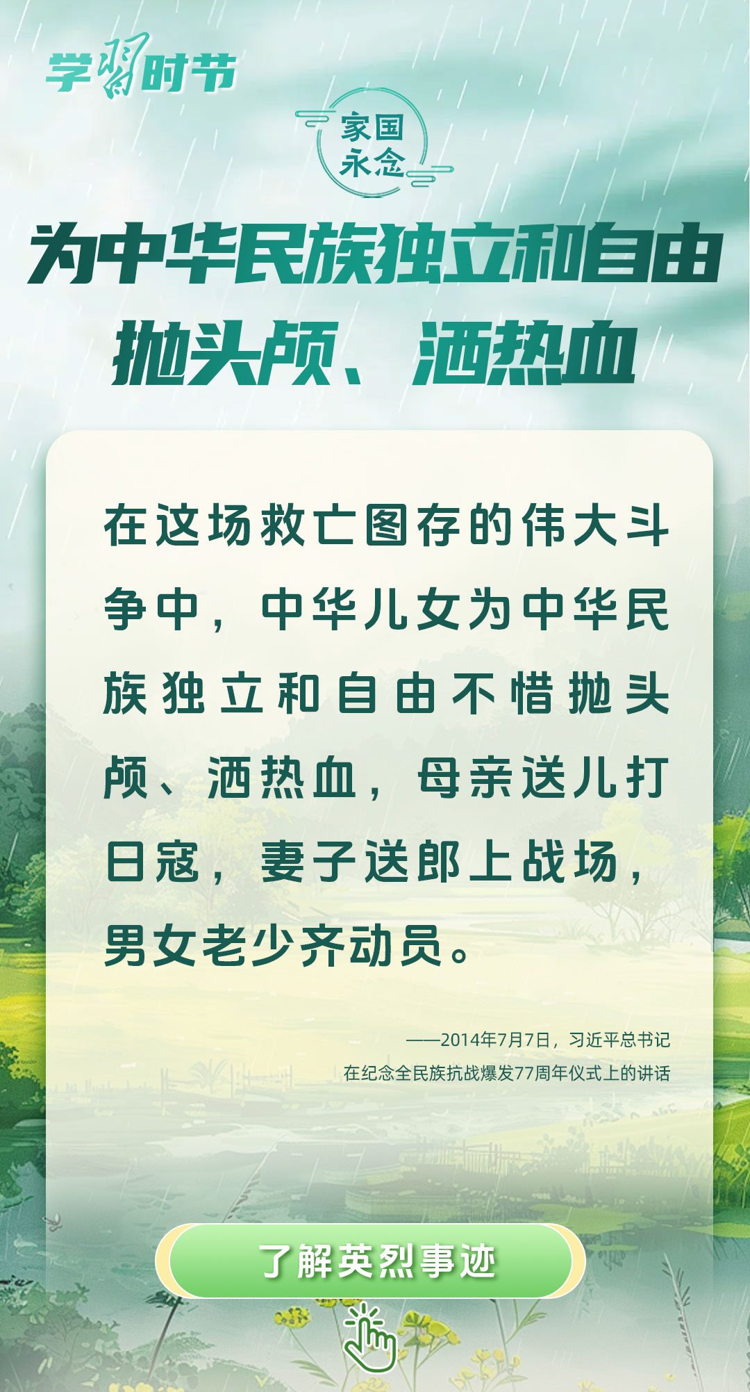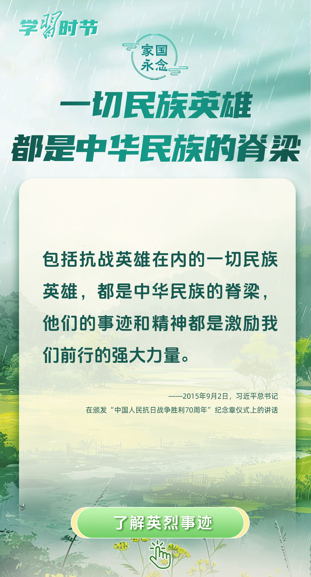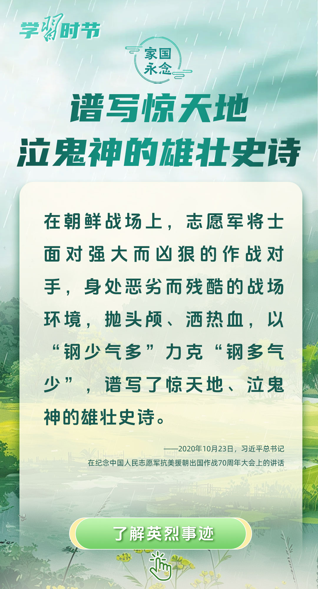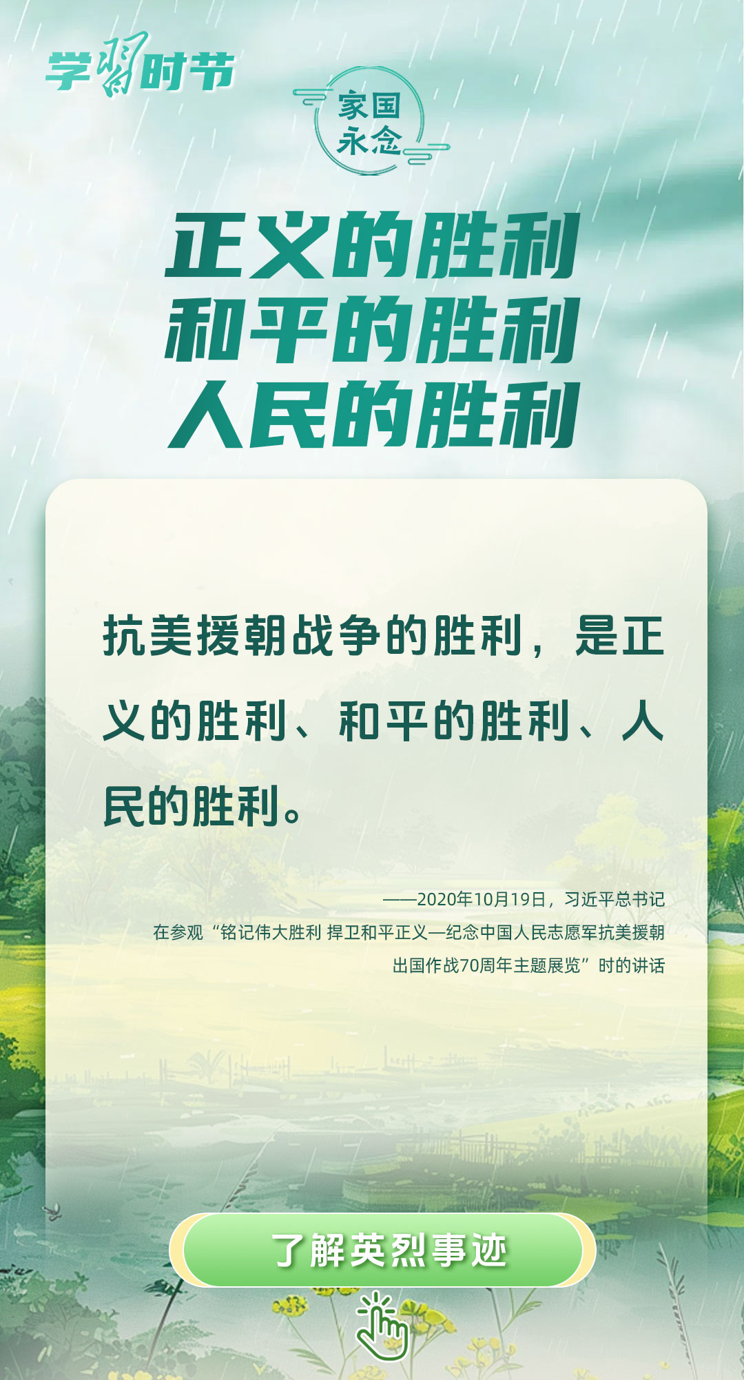 今年是中國人民抗日戰(zhàn)爭暨世界反法西斯戰(zhàn)爭勝利80周年、中國人民志愿軍抗美援朝出國作戰(zhàn)75周年。習(xí)近平總書記曾說:“對一切為國家、為民族、為和平付出寶貴生命的人們,不管時代怎樣變化,我們都要永遠銘記他們的犧牲和奉獻?!苯裉煳覀兯鶕碛械囊磺?,無不凝結(jié)著英雄、英烈們的奉獻付出乃至巨大犧牲。