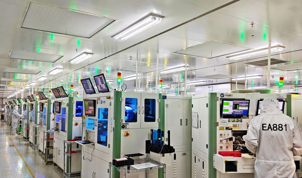 走進(jìn)重慶市天實精工科技有限公司無塵車間,智能機器人有條不紊地將芯片送上生產(chǎn)線,經(jīng)過自動清洗、表面貼裝、芯片封裝、鏡頭裝聯(lián)等工序,一顆顆攝像頭模組就此誕生。