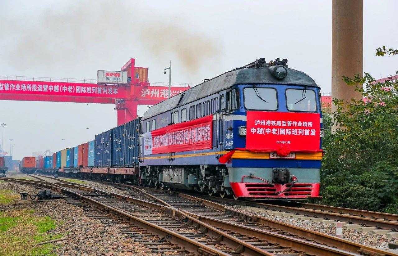 2024年12月18日,四川瀘州首列中越(中老)國際班列,從瀘州港國際集裝箱碼頭進港鐵路專線緩緩駛出。