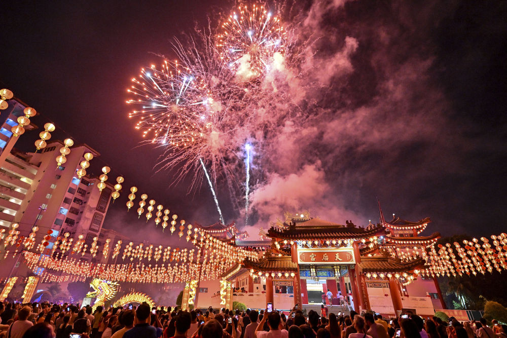2024年2月24日,馬來西亞首都吉隆坡天后宮的煙花表演,吸引眾多市民到場一同慶祝元宵佳節(jié)。