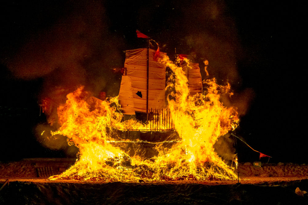 送王船是廣泛流傳于我國閩南地區(qū)和馬來西亞馬六甲沿海地區(qū)禳災(zāi)祈安的民俗活動(dòng)。2020年,中國與馬來西亞聯(lián)合申報(bào)的“送王船——有關(guān)人與海洋可持續(xù)聯(lián)系的儀式及相關(guān)實(shí)踐”項(xiàng)目,被列入聯(lián)合國教科文組織人類非物質(zhì)文化遺產(chǎn)代表作名錄。這是2020年11月16日,在馬來西亞馬六甲,人們點(diǎn)燃“國安號(hào)”王船。
