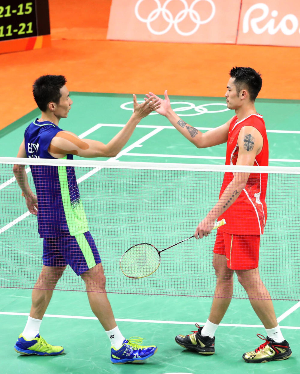 2016年8月19日,里約奧運(yùn)會(huì)羽毛球男子單打半決賽后,馬來西亞選手李宗偉(左)和中國選手林丹握手致意。