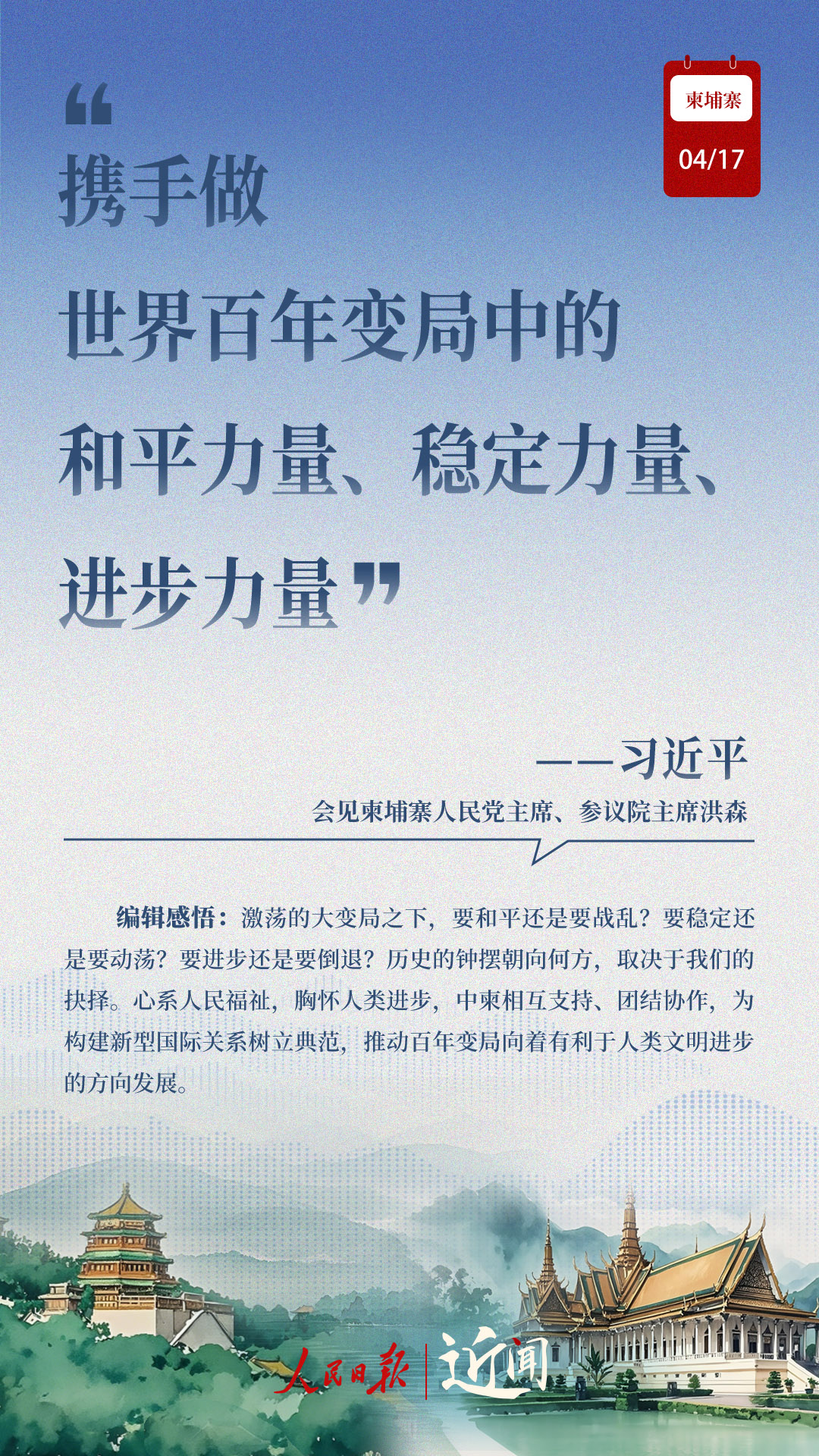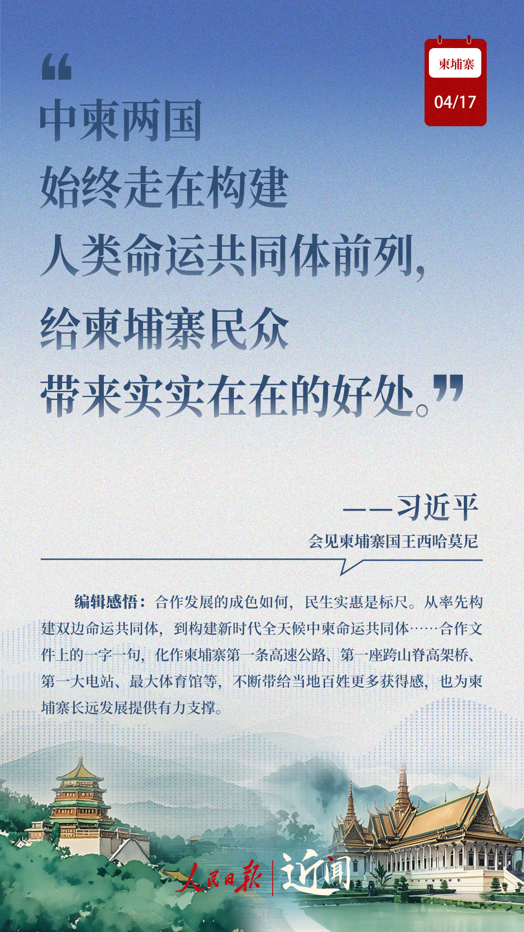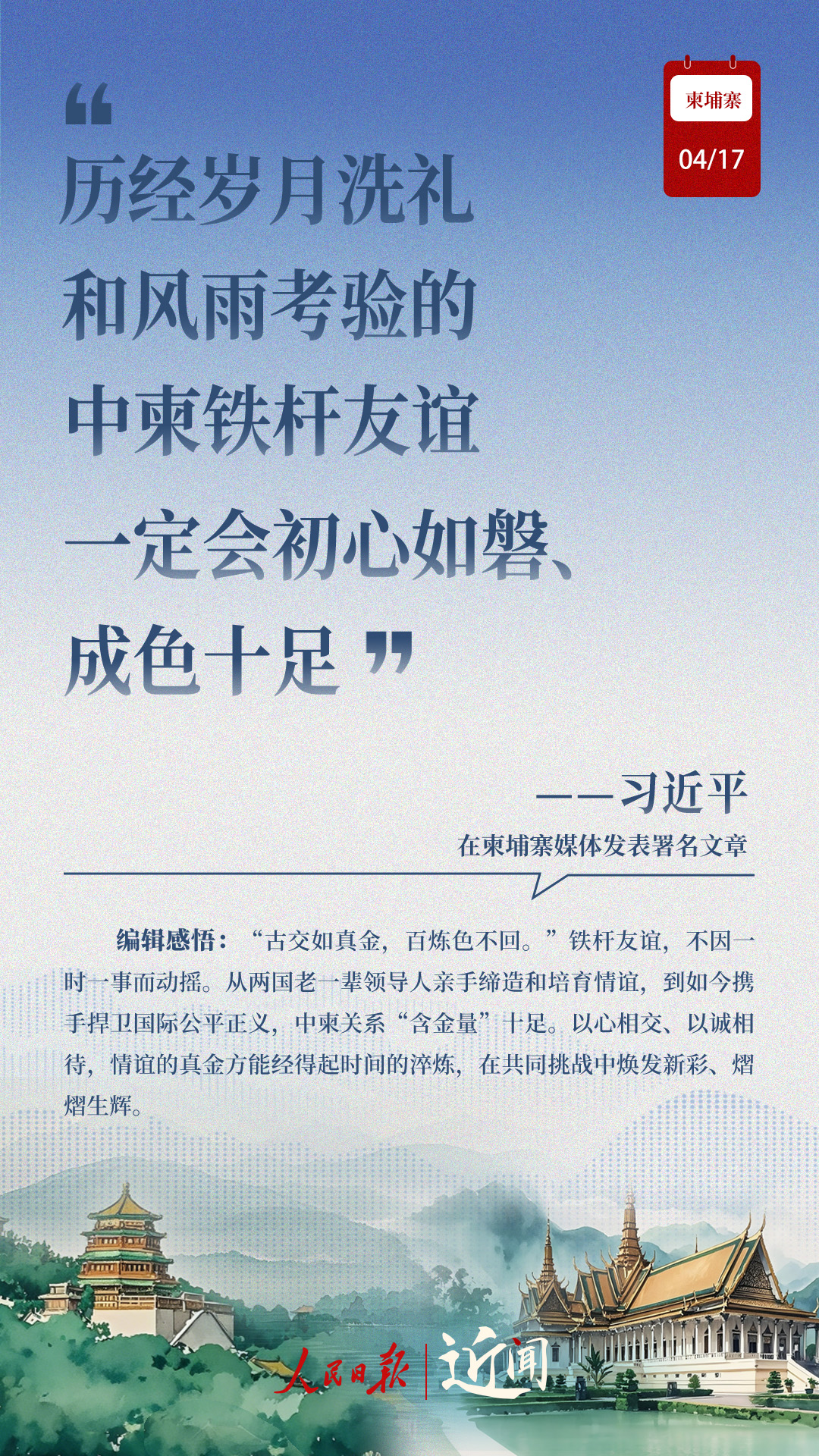 “古交如真金,百煉色不回?!睆膬蓢弦惠咁I導人親手締造和培育兩國友好,到率先構建雙邊命運共同體,再到構建新時代全天候中柬命運共同體,中柬關系新定位水到渠成。