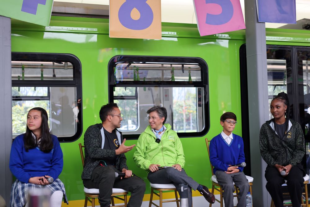 2023年8月10日,哥倫比亞波哥大市長克勞迪婭·洛佩斯(中)在波哥大地鐵的模型車廂旁跟參加活動(dòng)的師生交流。按照計(jì)劃,由中企承建和運(yùn)營的波哥大地鐵一號(hào)線將在2028年正式投入運(yùn)營。