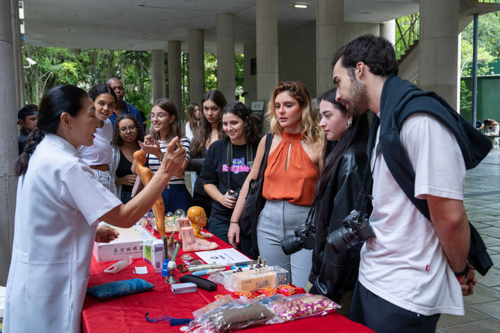 2025年4月15日,在巴西里約熱內(nèi)盧天主教大學(xué)舉辦的“國際中文日”慶祝活動(dòng)上,學(xué)生們觀看中醫(yī)療法展示。