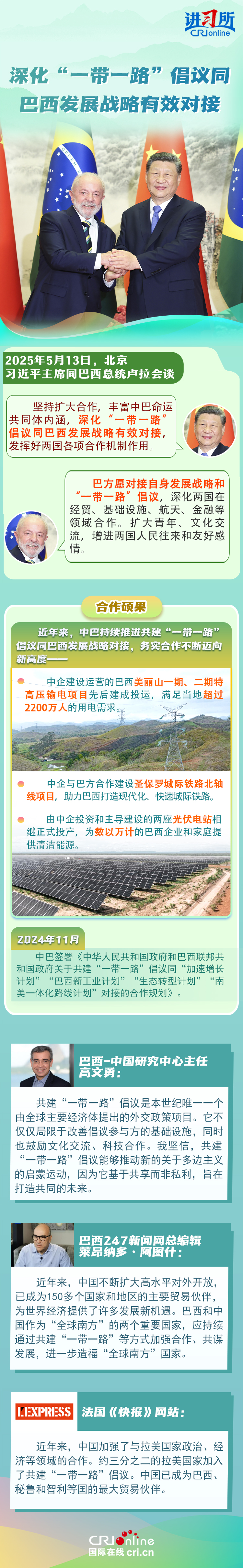 習(xí)近平主席在這三場(chǎng)雙邊外事活動(dòng)中,均提到了共建“一帶一路”倡議:“深化‘一帶一路’倡議同巴西發(fā)展戰(zhàn)略有效對(duì)接”“要以哥倫比亞正式加入高質(zhì)量共建‘一帶一路’大家庭為契機(jī),推動(dòng)兩國(guó)合作提質(zhì)升級(jí)”“雙方要落實(shí)好共建‘一帶一路’合作規(guī)劃”……10多年來(lái),在習(xí)近平主席親自擘畫(huà)和推動(dòng)下,共建“一帶一路”從中國(guó)倡議走向國(guó)際實(shí)踐,取得了實(shí)打?qū)?、沉甸甸的成就?/p>