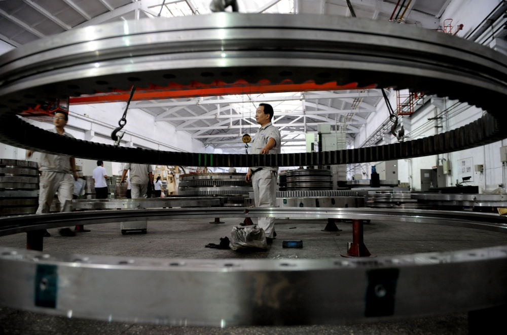1966年,洛陽(yáng)軸承廠檢驗(yàn)員在細(xì)心檢查即將出廠的一批特大型軸承的質(zhì)量。
