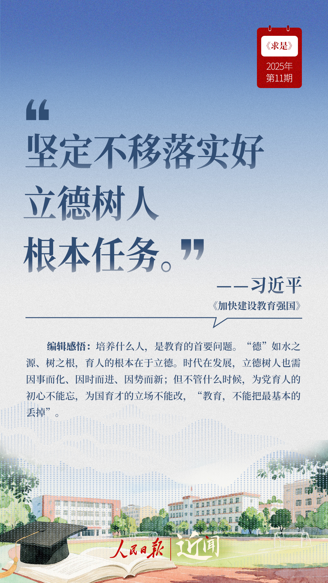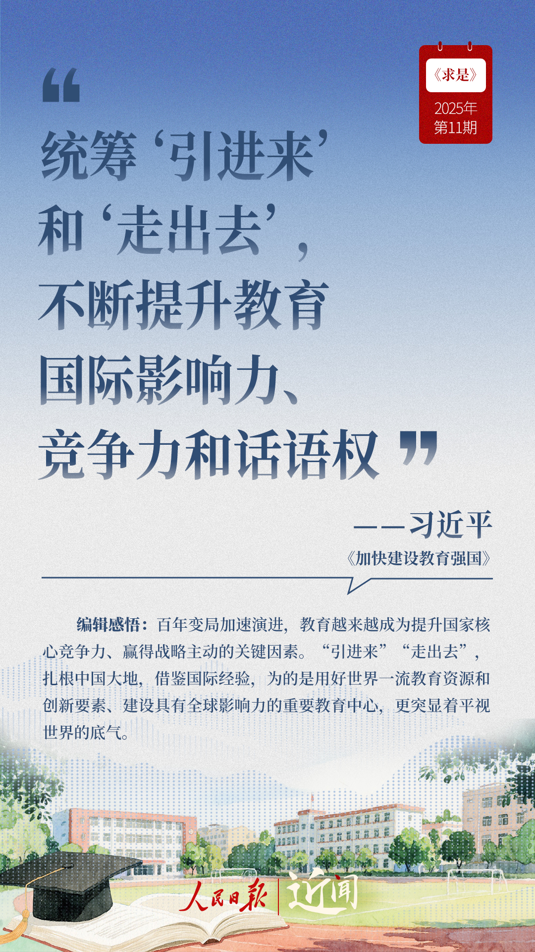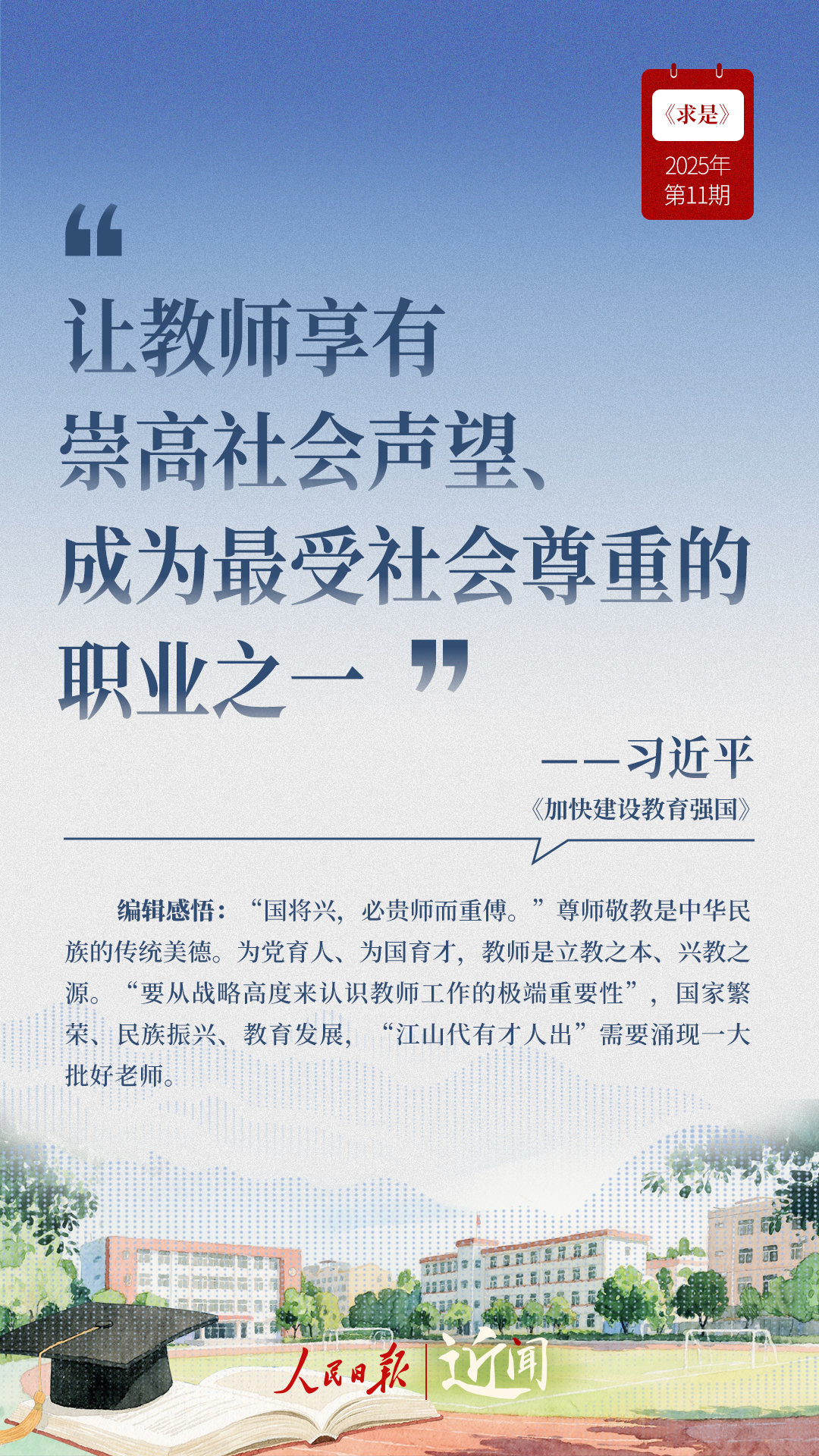 教育是國之大計、黨之大計。日前,《求是》雜志發(fā)表習(xí)近平總書記重要文章《加快建設(shè)教育強國》?!叭姘盐战逃恼螌傩浴⑷嗣駥傩?、戰(zhàn)略屬性”“讓教育改革發(fā)展成果更多更公平惠及全體人民”“讓教師享有崇高社會聲望、成為最受社會尊重的職業(yè)之一”……通過這些話,一起感悟習(xí)近平總書記對教育強國建設(shè)的謀劃與部署。