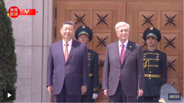 習近平抵達阿斯塔納納扎爾巴耶夫國際機場時,托卡耶夫總統(tǒng)率總統(tǒng)辦公廳主任達杰拜、副總理兼外長努爾特列烏、總統(tǒng)外事顧問卡濟漢、阿斯塔納市長卡瑟姆別克等高級官員熱情迎接。身著盛裝的哈薩克斯坦女青年向習近平獻花。禮兵分列藍地毯兩側致敬,哈薩克斯坦少年兒童手持中哈兩國國旗熱烈歡迎習近平到訪。習近平在托卡耶夫陪同下觀看儀仗隊分列式,直升機懸掛中哈國旗從機場上空飛過。在機場貴賓樓內(nèi),兩國元首還共同欣賞哈薩克斯坦少年兒童的文藝表演。