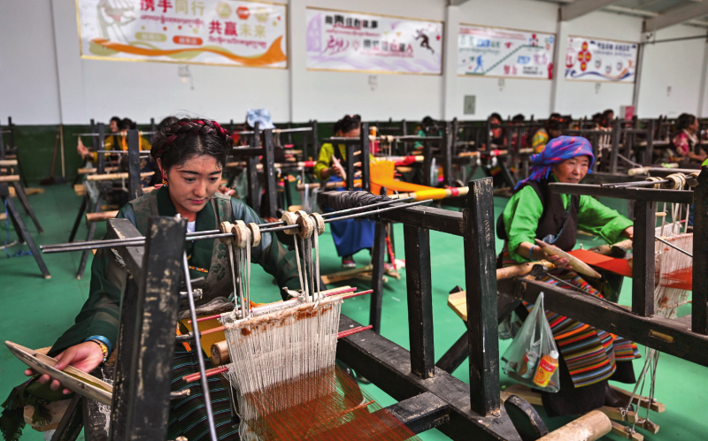 在西藏日喀則市仁布縣特色產(chǎn)業(yè)孵化園,亞德細(xì)褐羊毛織品農(nóng)民專業(yè)合作社工作人員在車(chē)間里織布(2024年9月1日攝)孫瑞博攝/本刊