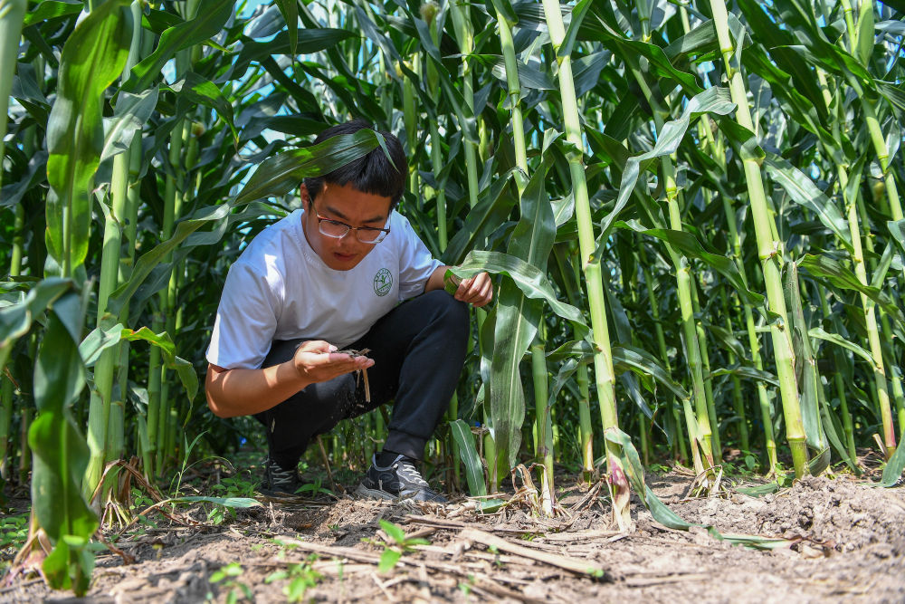 2023年7月31日,在位于吉林省四平市梨樹縣的中國農(nóng)業(yè)大學(xué)“科技小院”保護(hù)性耕作試驗(yàn)田,一名學(xué)生查看玉米根部在黑土中的生長情況。